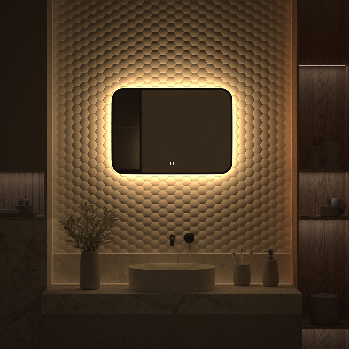 Светодиодная подсветка с цветовой температурой 3000 Кельвинов обеспечивает яркость и комфортную атмосферу в любое время суток. Это зеркало оборудовано встроенным сенсорным выключателем с регулировкой яркости и может быть легко подключено к подготовленному электро-выводу из стены.