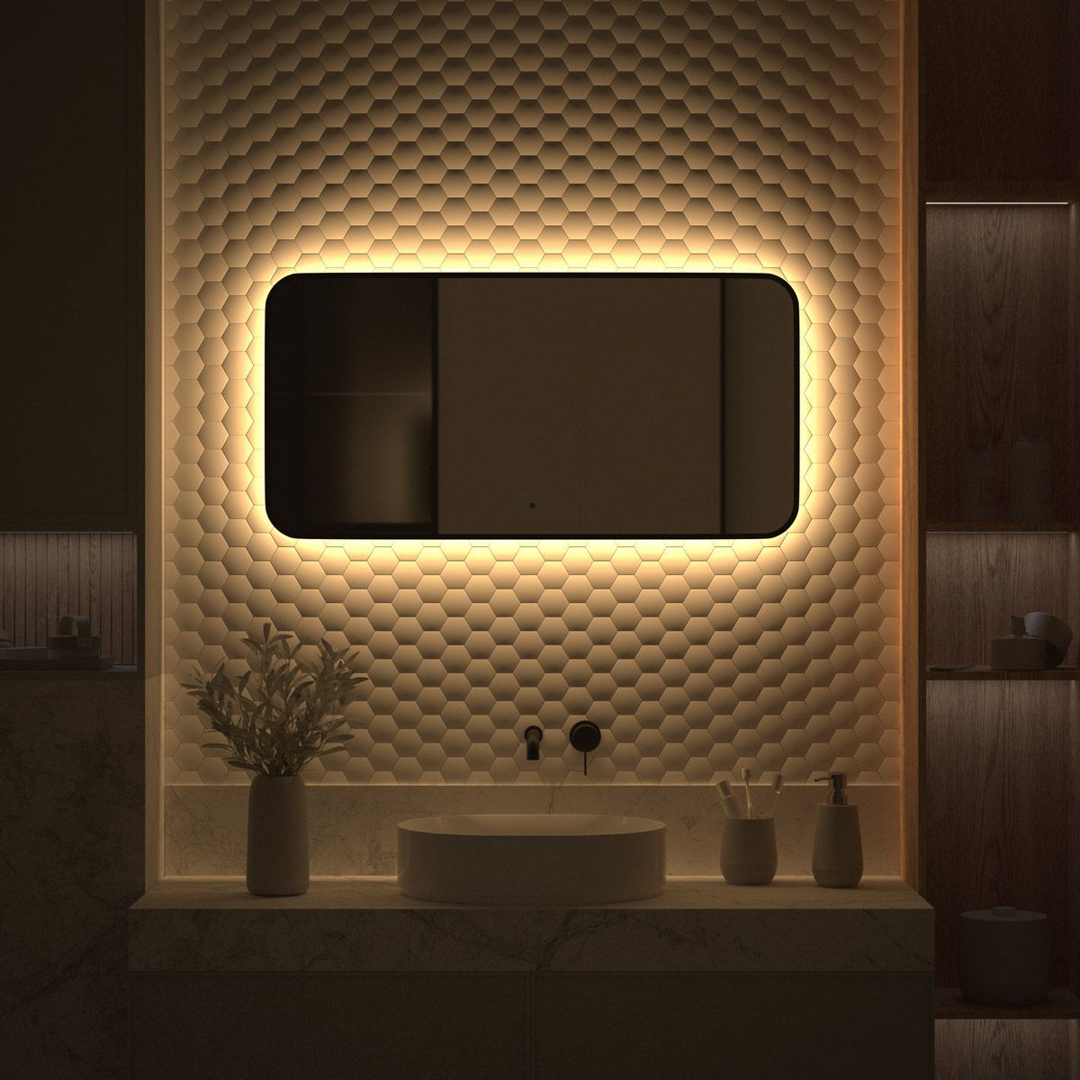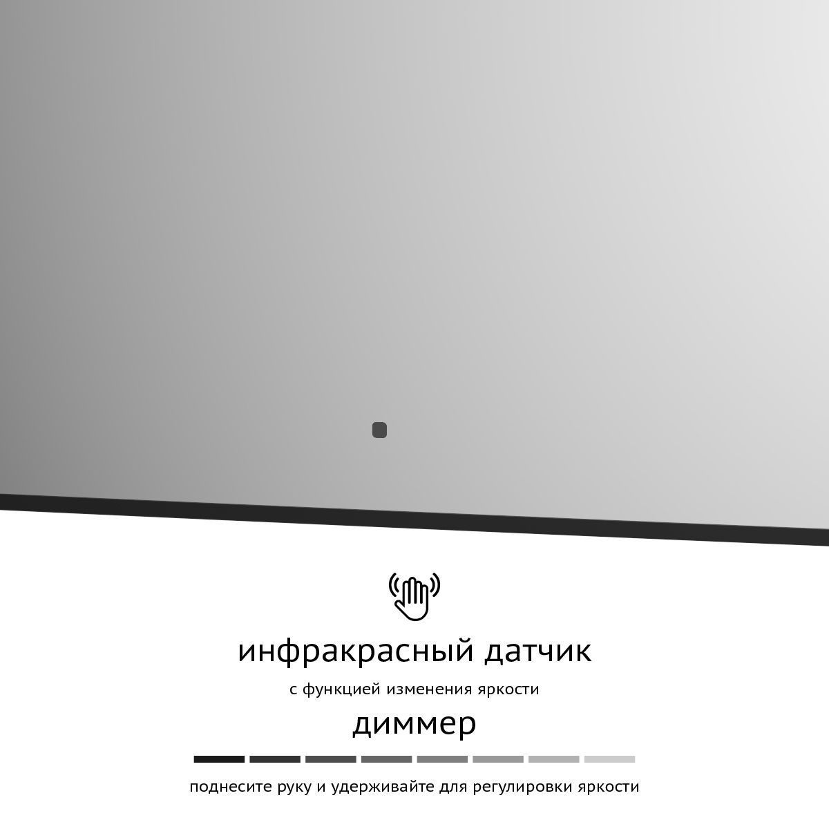 Светодиодная подсветка с цветовой температурой 3000 Кельвинов обеспечивает яркость и комфортную атмосферу в любое время суток. Это зеркало оборудовано встроенным инфракрасным выключателем с регулировкой яркости и может быть легко подключено к подготовленному электро-выводу из стены.