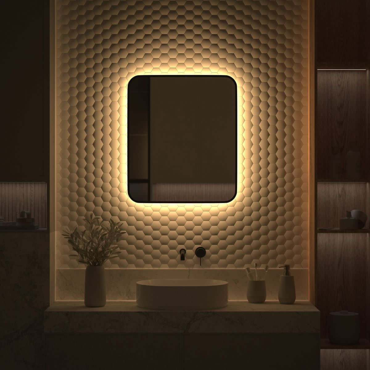 Светодиодная подсветка с цветовой температурой 3000 Кельвинов обеспечивает яркость и комфортную атмосферу в любое время суток. Это зеркало не имеет выключателя и может быть легко подключено к подготовленному электро-выводу из стены. Возможен как вертикальный, так и горизонтальный монтаж.