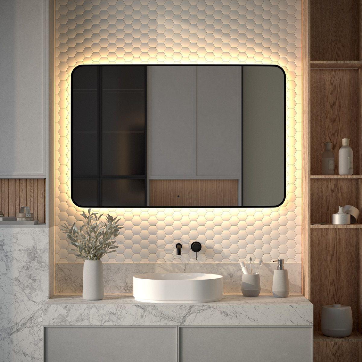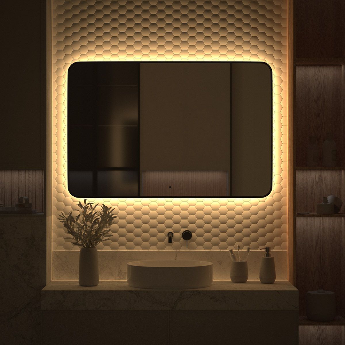 Светодиодная подсветка с цветовой температурой 3000 Кельвинов обеспечивает яркость и комфортную атмосферу в любое время суток. Это зеркало оборудовано встроенным инфракрасным выключателем с регулировкой яркости и может быть легко подключено к подготовленному электро-выводу из стены.