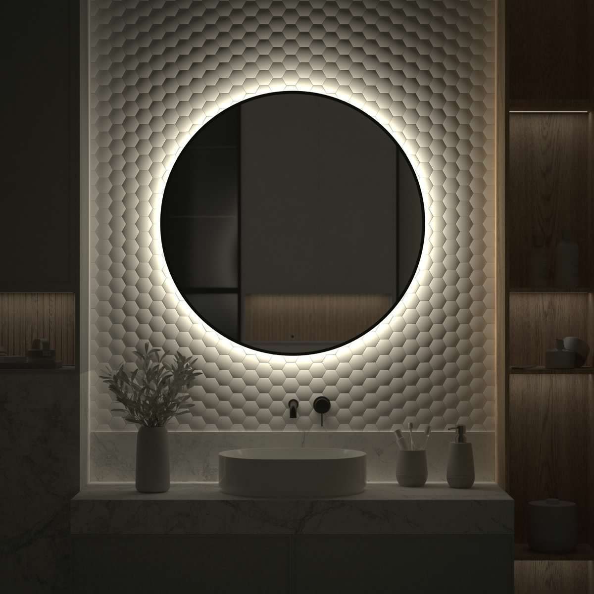 Светодиодная подсветка с цветовой температурой 4500 Кельвинов обеспечивает яркость и комфортную атмосферу в любое время суток. Это зеркало оборудовано встроенным инфракрасным выключателем с регулировкой яркости и может быть легко подключено к подготовленному электро-выводу из стены.