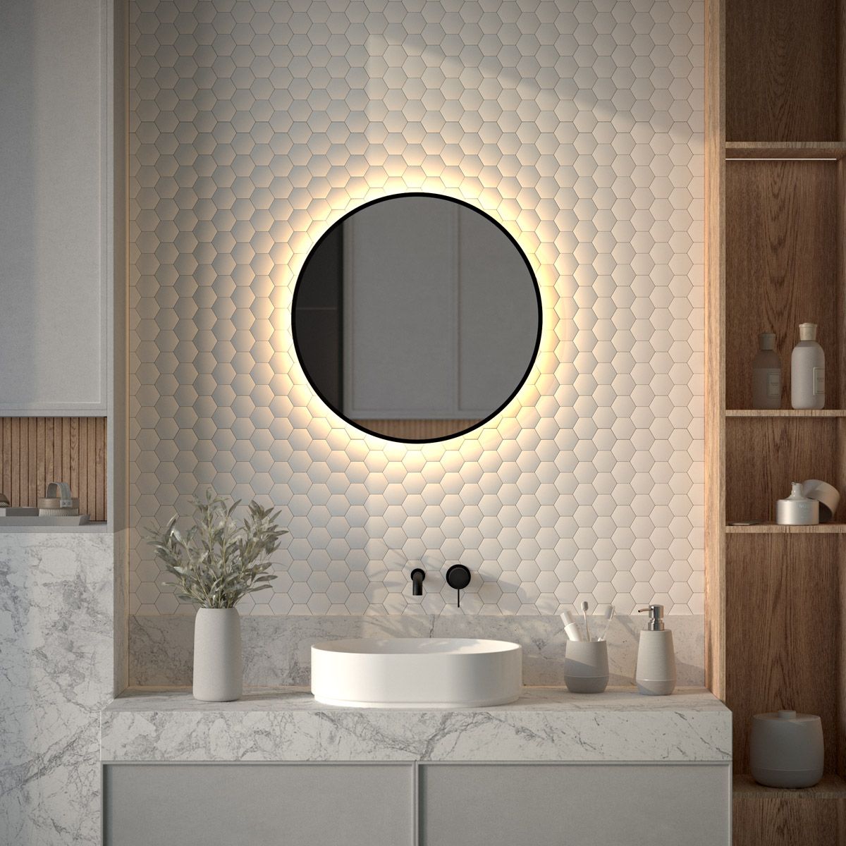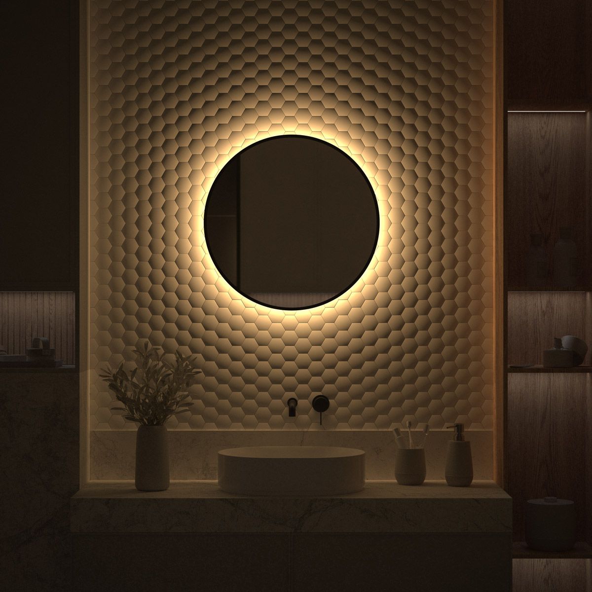 Светодиодная подсветка с цветовой температурой 3000 Кельвинов обеспечивает яркость и комфортную атмосферу в любое время суток. Это зеркало не имеет выключателя и может быть легко подключено к подготовленному электро-выводу из стены.