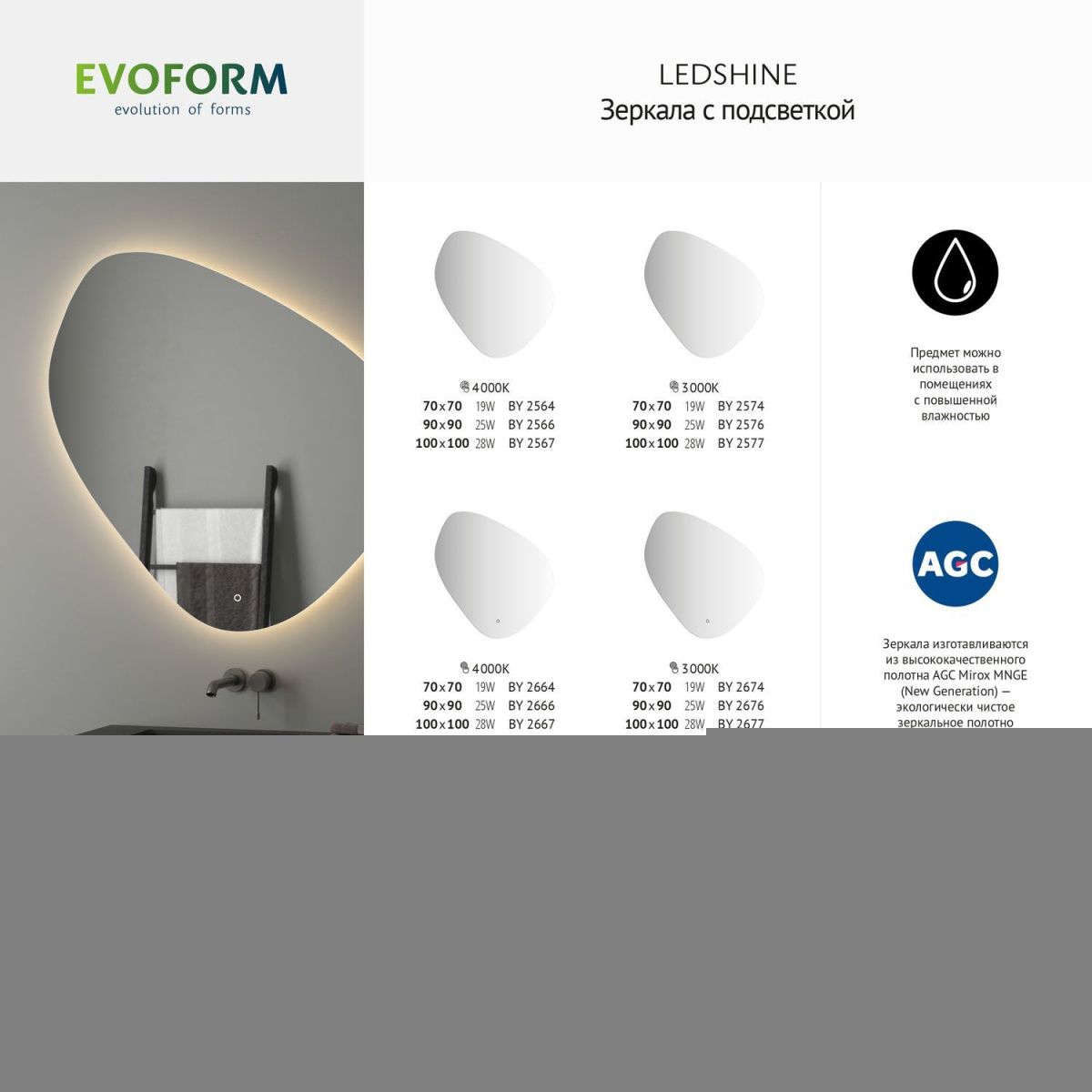 Компания ООО «САНТЕХ АЛЬЯНС» при изготовлении зеркал торговой марки «Evoform» использует серебряные зеркальные полотна мирового производителя AGC- Asahi Glass Co (Япония). AGC - первая компания, применившая новейшую технологию Mirox, которая стала мировым эталоном. Mirox New Generation Ecological - это новое поколение экологически чистых, высококачественных, стойких к воздействиям зеркал, характеристики которых превосходят требования самых строгих стандартов. ПРЕИМУЩЕСТВА: Высокие антикоррозионные свойства; Способность готового продукта противостоять химическим повреждениям; Срок полезного использования в 3 раза превышает аналогичный показатель традиционных зеркал; Повышенная стойкость к абразивным средствам очистки: в семь раз выше, чем у традиционных зеркал; Отсутствие точечной коррозии и «цветения» с течением времени; Сертификация Cradle to Cradle - безотходная система производства; Испарение летучих органических соединений и формальдегида сведено к минимуму; Устойчивы к высоким температурам при равномерном нагревании (до 80°C).  Компания располагает современным оборудованием, владеет новейшими технологиями и имеет в штате квалифицированный персонал. Высоких стандартов качества продукции предприятию удается достигнуть благодаря использованию специализированного оборудования ведущих европейских производителей и высококачественного экологически безопасного зеркального полотна. Широкий модельный ряд позволяет максимально удовлетворить самые разнообразные пожелания покупателей. ООО «САНТЕХ АЛЬЯНС» уже много лет производит и реализует зеркала для ванной комнаты, зеркала изготавливаются с соблюдением всех необходимых условий производства. По праву можно назвать наш ассортимент одним из самых больших среди европейских производителей, работающих со складским остатком.
