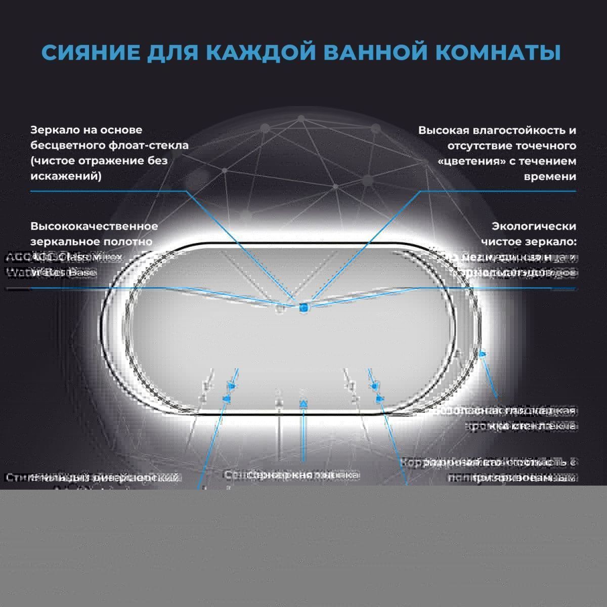 Безупречное японское стекло — результат непрерывного развития технологий, оно соответствует единой системе защиты от коррозии и отсутствию точечного «цветения» с течением времени. В зеркале с интерьерной и фронтальной подсветкой функциональность гармонично соединена с дизайном. Интерьерная подсветка, наполняет пространство светом и придает конструкции легкость. Фронтальный свет создает рассеянный комфортный для глаз поток, позволяющий рассмотреть каждую деталь отражения во время гигиенических и косметологических процедур.