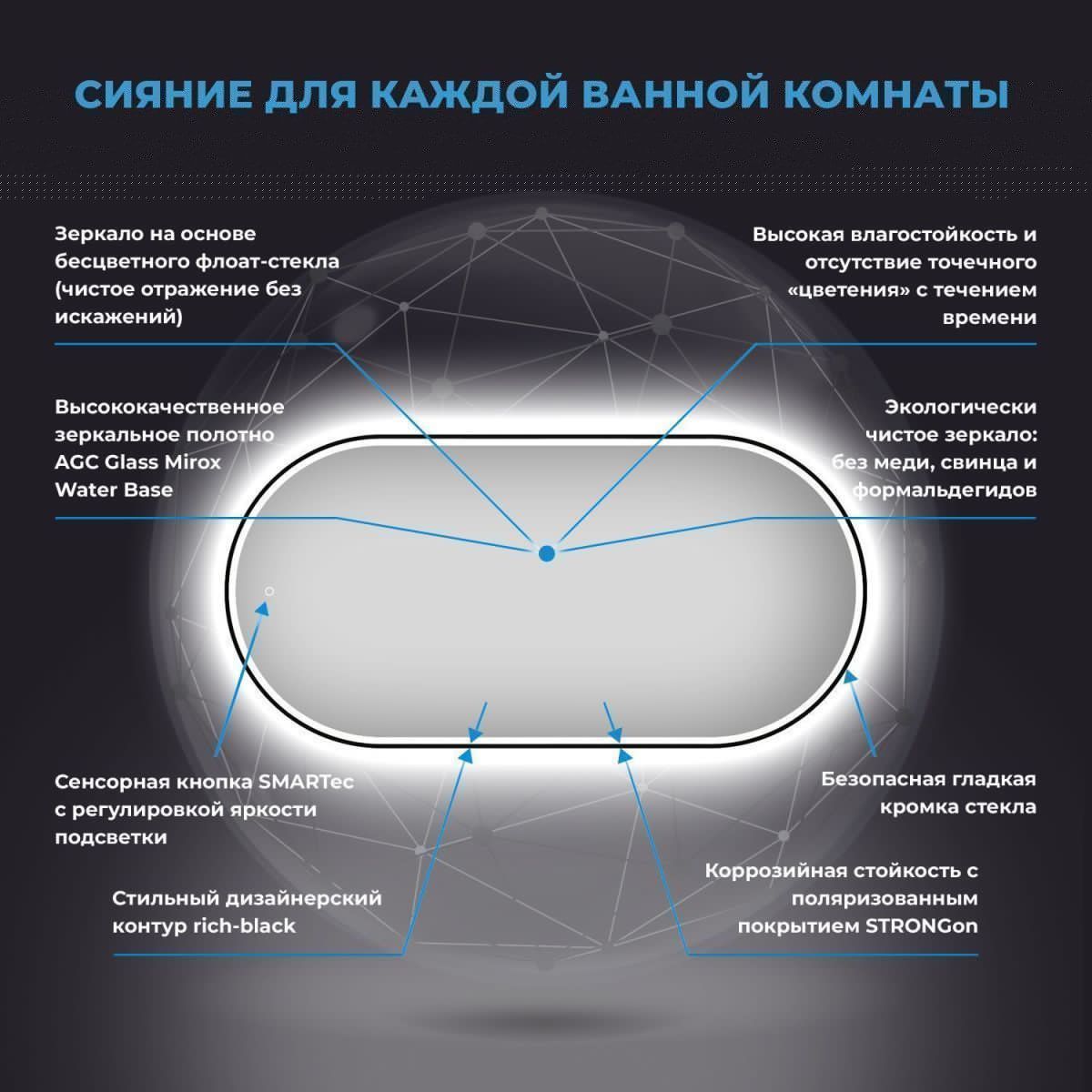 Безупречное японское стекло — результат непрерывного развития технологий, оно соответствует единой системе защиты от коррозии и отсутствию точечного «цветения» с течением времени. В зеркале с интерьерной и фронтальной подсветкой функциональность гармонично соединена с дизайном. Интерьерная подсветка, наполняет пространство светом и придает конструкции легкость. Фронтальный свет создает рассеянный комфортный для глаз поток, позволяющий рассмотреть каждую деталь отражения во время гигиенических и косметологических процедур.