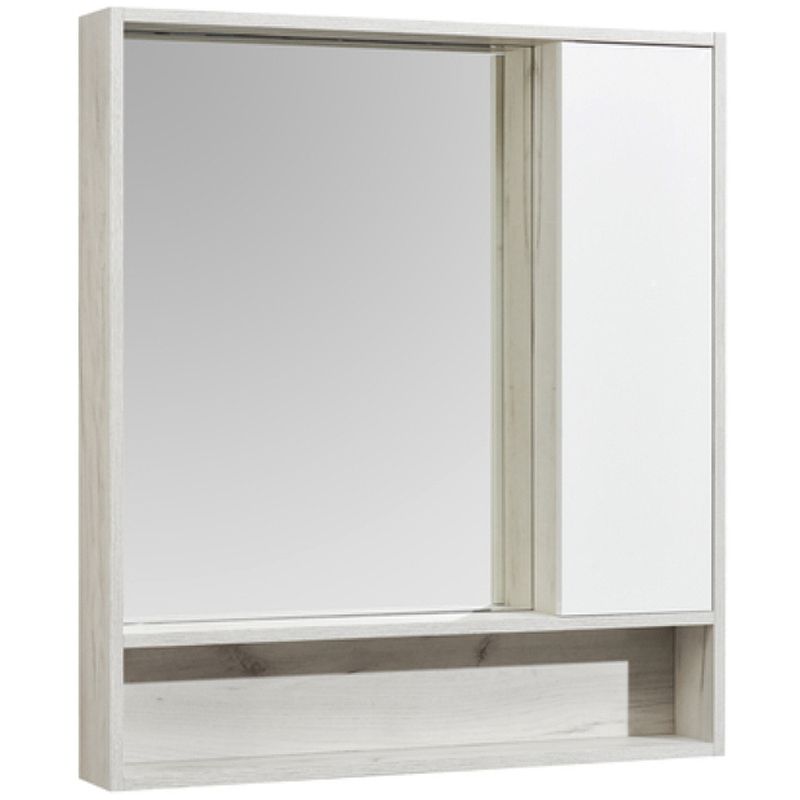 Корпус зеркального шкафа Флай 80 в современном стиле выполнен из влагостойкой ламинированной плиты в трендовом декоре дуб крафт. Фасад, расположенный справа, окрашен в белоснежный глянцевый цвет полиэфирной краской ультрафиолетового отверждения. Такой способ окрашивания обеспечивает изделию привлекательный внешний вид, а также износостойкость и долговечность. Петли снабжены доводчиками для удобства использования. За фасадом находятся две полочки из влагостойкой ламинированной плиты. Удобная полочка под зеркалом прекрасно подойдет для размещения различных мелочей и декора для ванной комнаты.