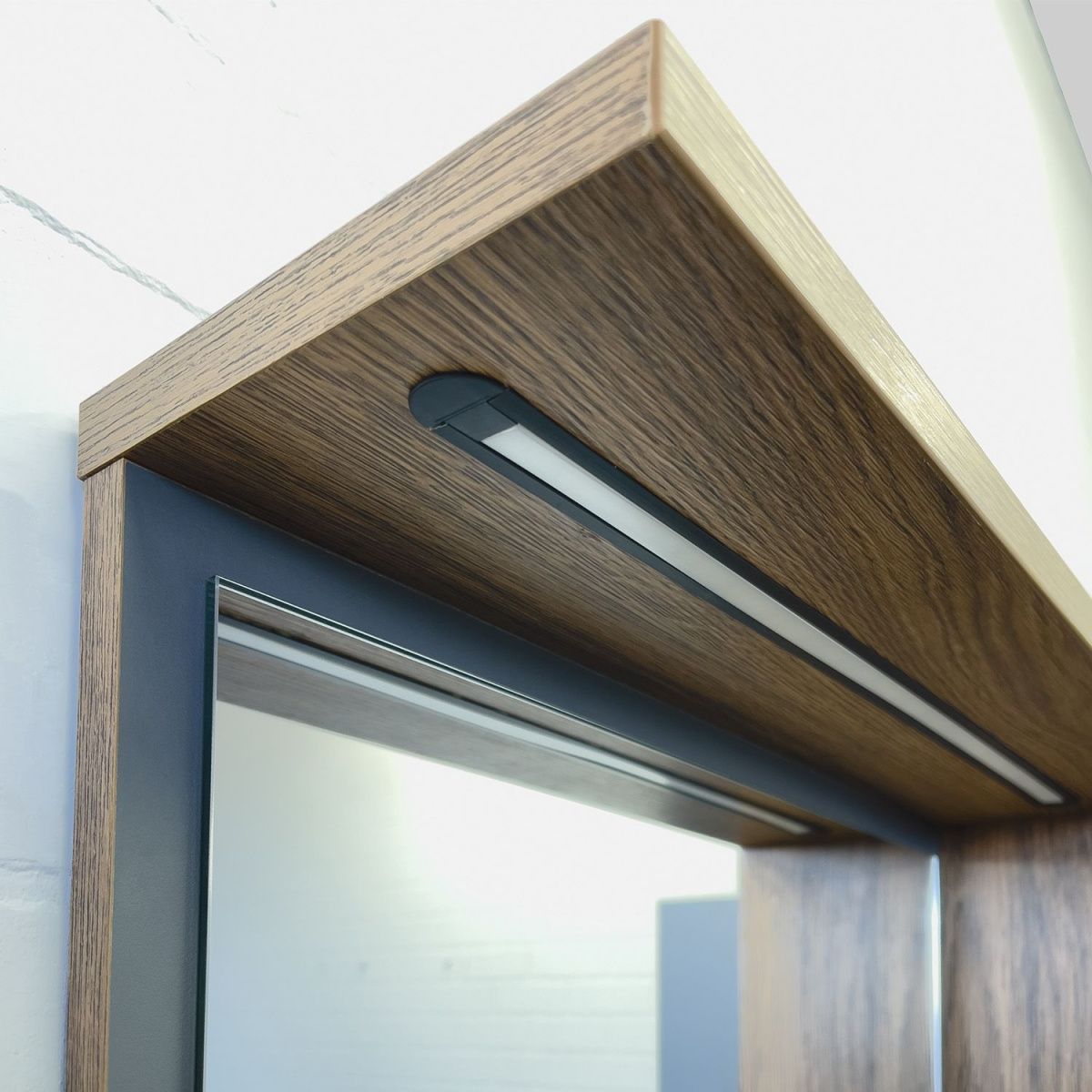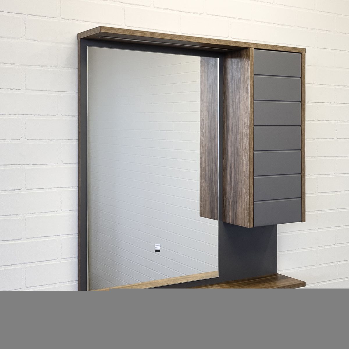 Зеркальное высококачественное полотно с амальгамой на основе серебра. За дверцей одна горизонтальная полка. Удобная полочка для размещения принадлежностей для умывания. В верхней полочке установлен LED светильник. Выключатель подсветки бесконтактный со встроенной функцией регулировки яркости. Температура подсветки: 6000-6500К холодная. Фасад зеркального шкафа изготовлен из МДФ и облицован в пленку цвета антрацит.