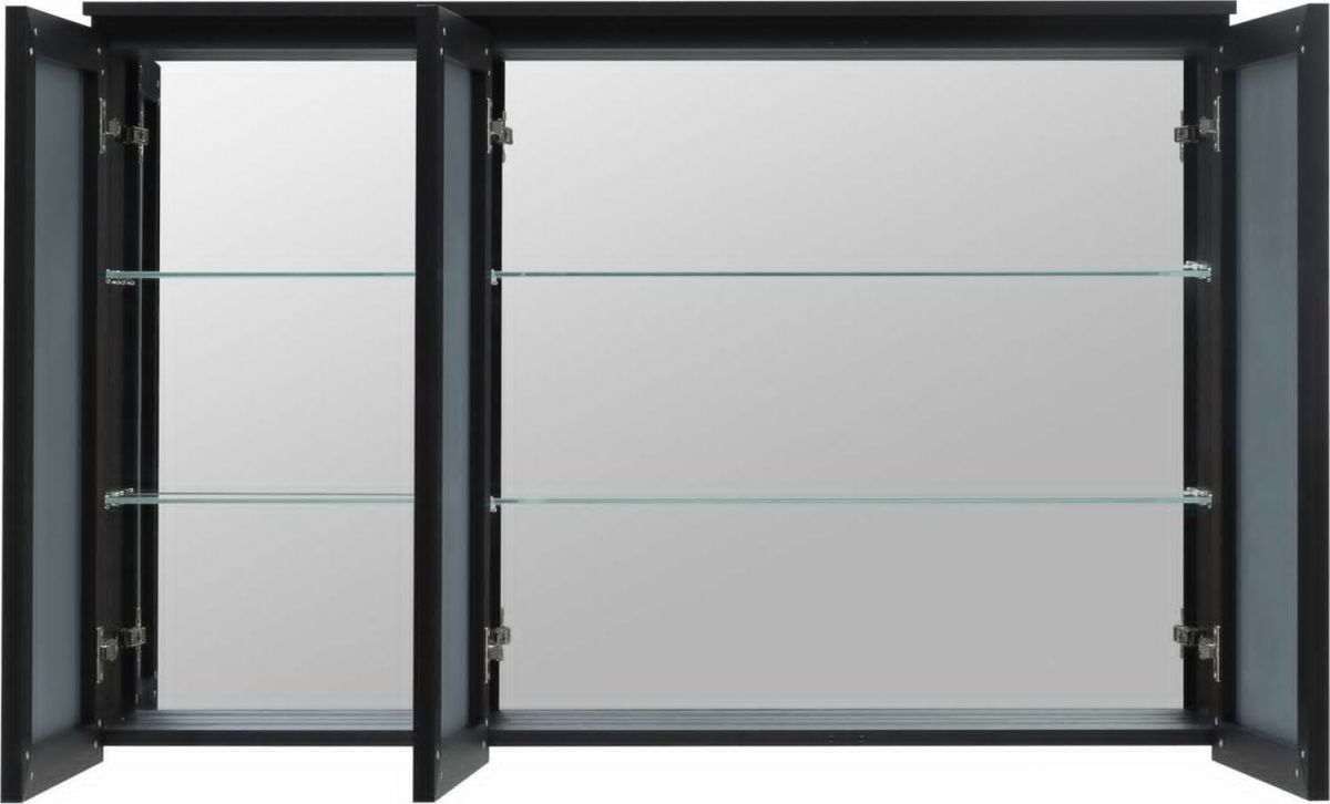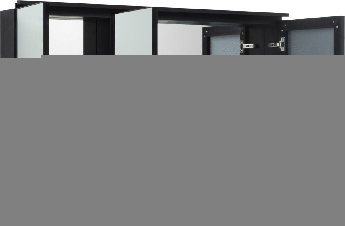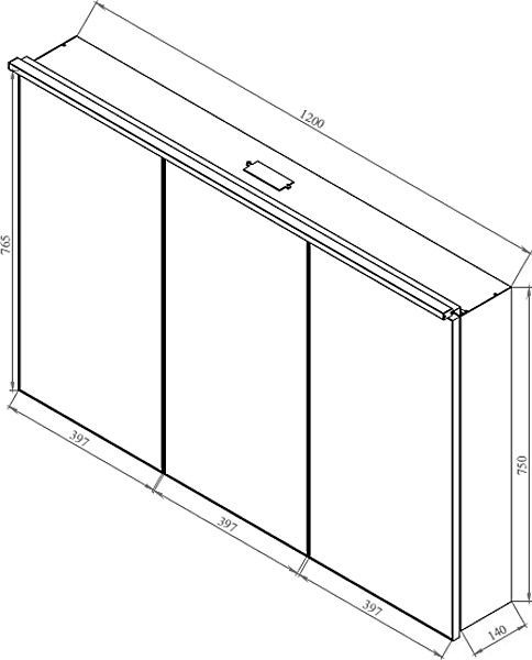 Распашные дверцы оснащаются доводчиками для плавного и бесшумного закрывания. За ними располагаются четыре стеклянные полки, подходящие для хранения гигиенических средств и косметики. Для ухода за зеркальной поверхностью рекомендуется применять специальные составы без абразивных частиц и мягкую ветошь. Модель подвесная и крепится к стене. Габариты — 1200х140х765 мм.