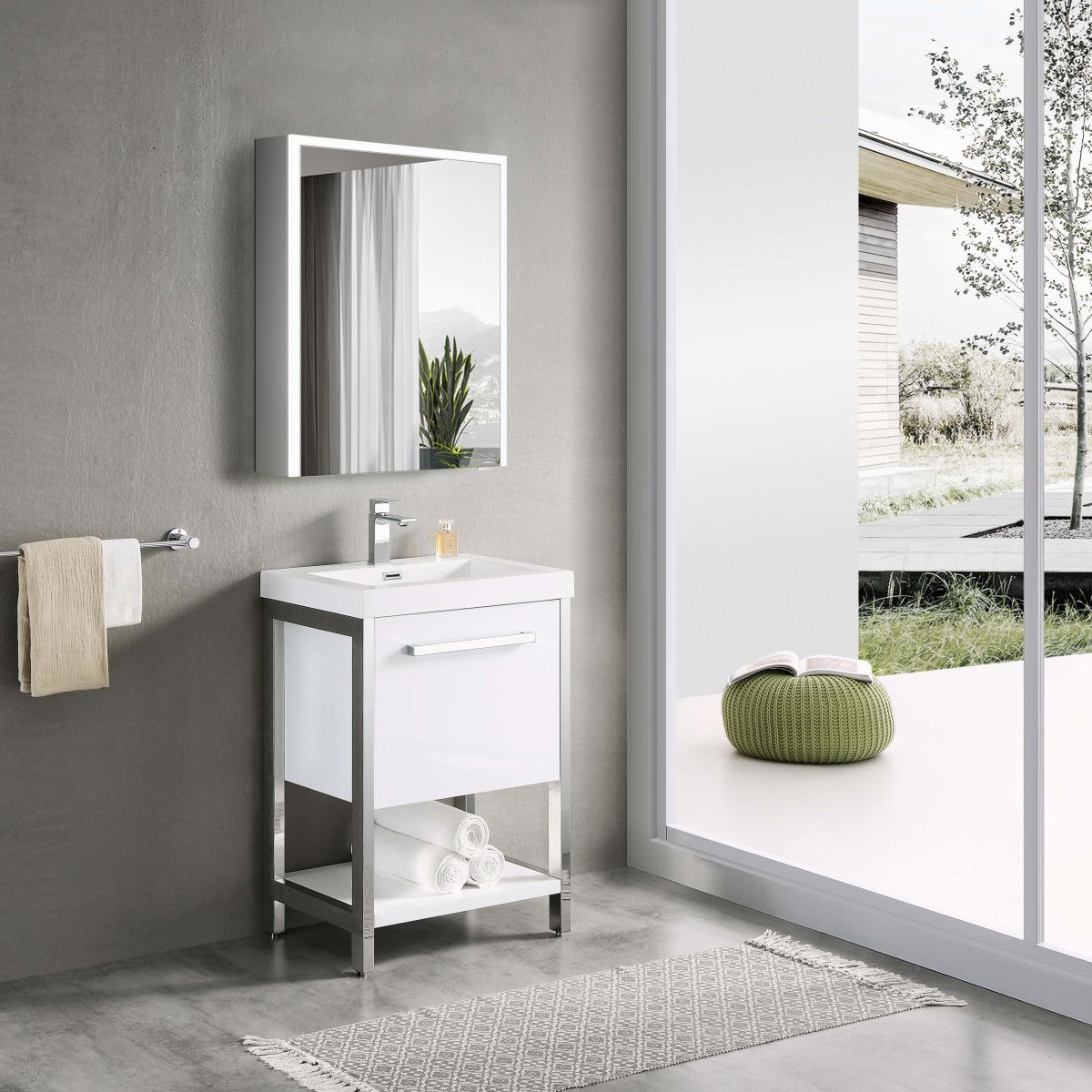 Корпус: алюминий. Дверки зеркальные внутри. Зеркало-линза. Полочка с регулировкой по высоте. Сенсорный/ИФК включатель. Мощность LED ленты: 38W