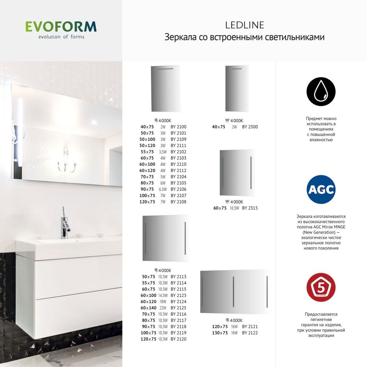 Компания ООО «САНТЕХ АЛЬЯНС» при изготовлении зеркал торговой марки «Evoform» использует серебряные зеркальные полотна мирового производителя AGC- Asahi Glass Co (Япония). AGC - первая компания, применившая новейшую технологию Mirox, которая стала мировым эталоном. Mirox New Generation Ecological - это новое поколение экологически чистых, высококачественных, стойких к воздействиям зеркал, характеристики которых превосходят требования самых строгих стандартов. ПРЕИМУЩЕСТВА: Высокие антикоррозионные свойства; Способность готового продукта противостоять химическим повреждениям; Срок полезного использования в 3 раза превышает аналогичный показатель традиционных зеркал; Повышенная стойкость к абразивным средствам очистки: в семь раз выше, чем у традиционных зеркал; Отсутствие точечной коррозии и «цветения» с течением времени; Сертификация Cradle to Cradle - безотходная система производства; Испарение летучих органических соединений и формальдегида сведено к минимуму; Устойчивы к высоким температурам при равномерном нагревании (до 80°C).  Компания располагает современным оборудованием, владеет новейшими технологиями и имеет в штате квалифицированный персонал. Высоких стандартов качества продукции предприятию удается достигнуть благодаря использованию специализированного оборудования ведущих европейских производителей и высококачественного экологически безопасного зеркального полотна. Широкий модельный ряд позволяет максимально удовлетворить самые разнообразные пожелания покупателей. ООО «САНТЕХ АЛЬЯНС» уже много лет производит и реализует зеркала для ванной комнаты, зеркала изготавливаются с соблюдением всех необходимых условий производства. По праву можно назвать наш ассортимент одним из самых больших среди европейских производителей, работающих со складским остатком.