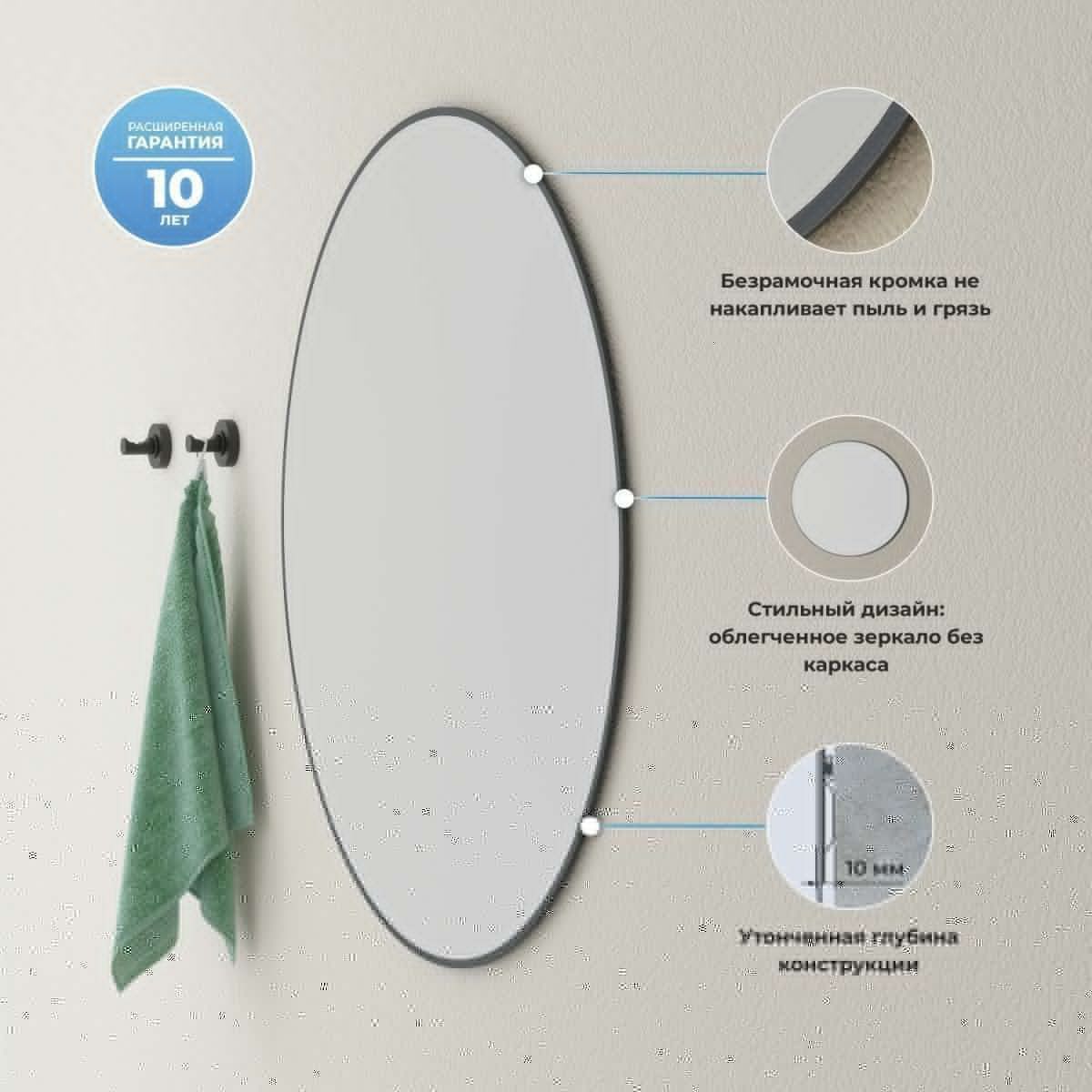 Зеркало без подсветки великолепно дополнит помещение с многоуровневым освещением. Оно концентрирует внимание и не отвлекает от главного – идеального отражения, а черный матовый контур деликатно обрамляет изделие.