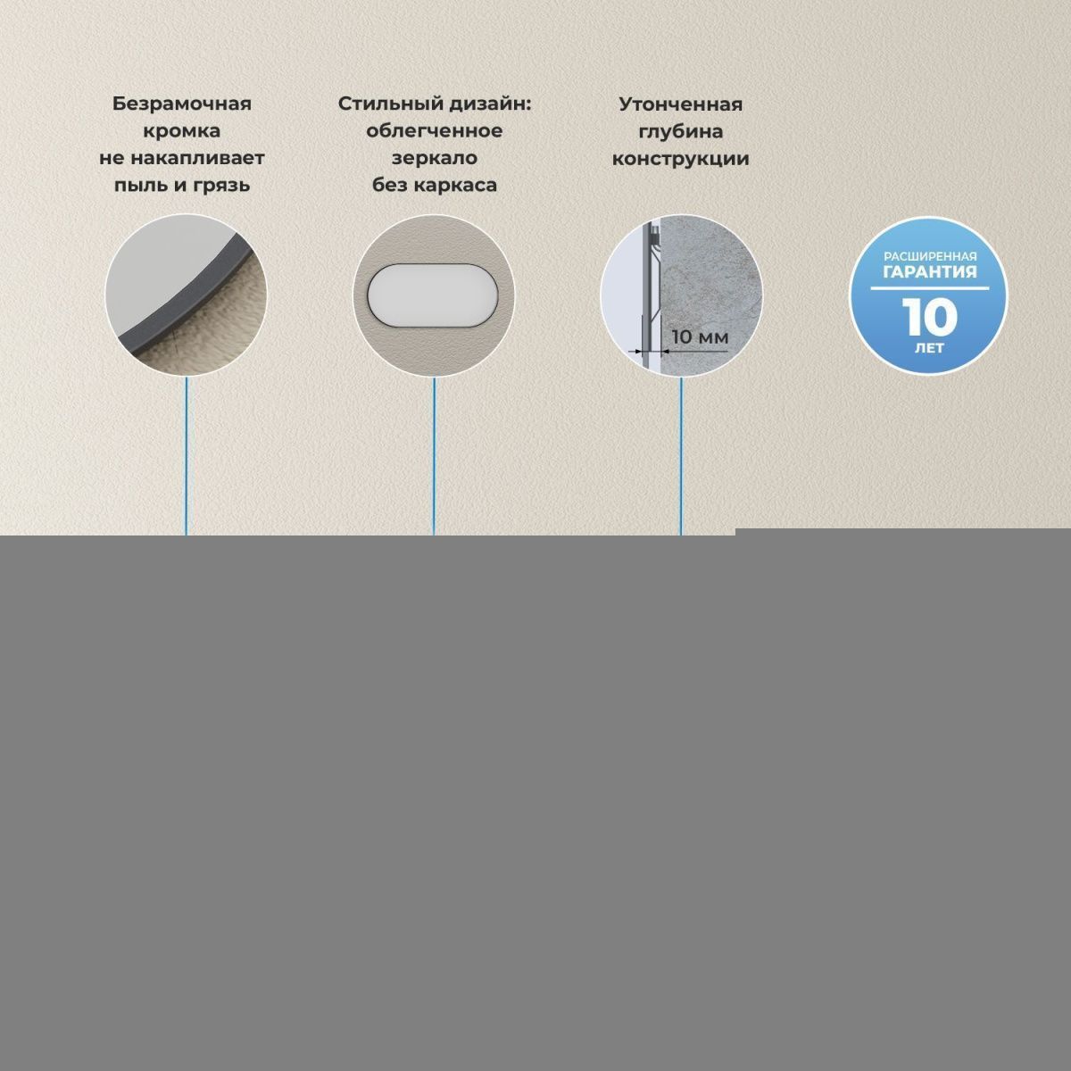 Зеркало без подсветки великолепно дополнит помещение с многоуровневым освещением. Оно концентрирует внимание и не отвлекает от главного – идеального отражения, а черный матовый контур деликатно обрамляет изделие.