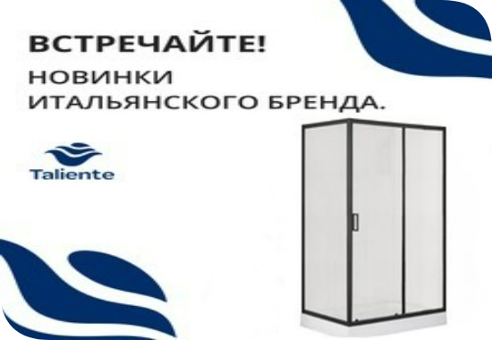 Встречайте! Впервые! Новинки итальянского бренда Taliente с жаркими скидками! С 1 сентября 2024 года успейте приобрести желанную сантехнику со скидкой до 15%! Так же бренд порадует нас горячими новинками этой осени, чтобы вы точно не замерзли! Гидромассажные панели, стойки, душевые двери, перегородки, уголки - всё это может стать вашим уже сегодня! Спешите за покупками!