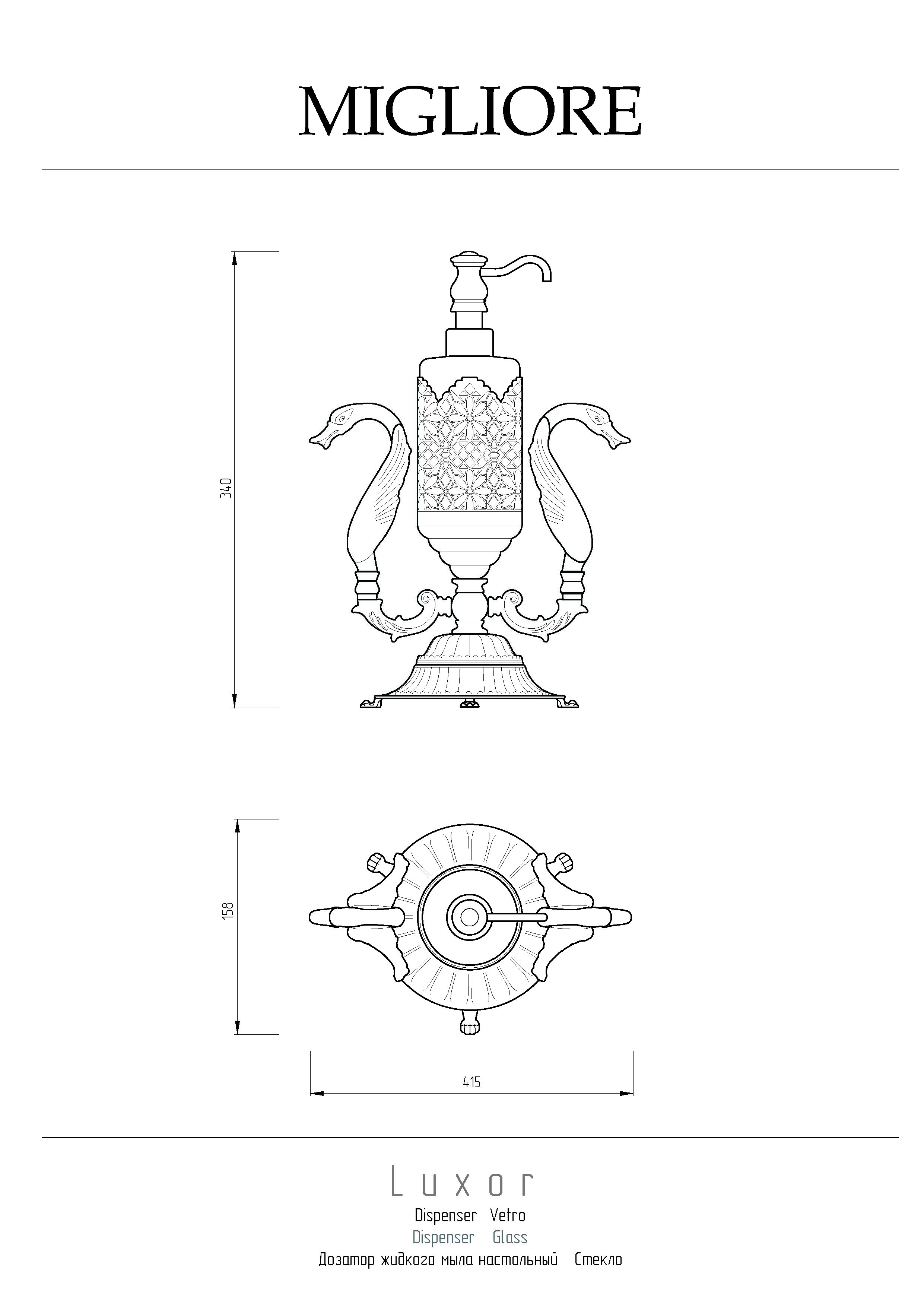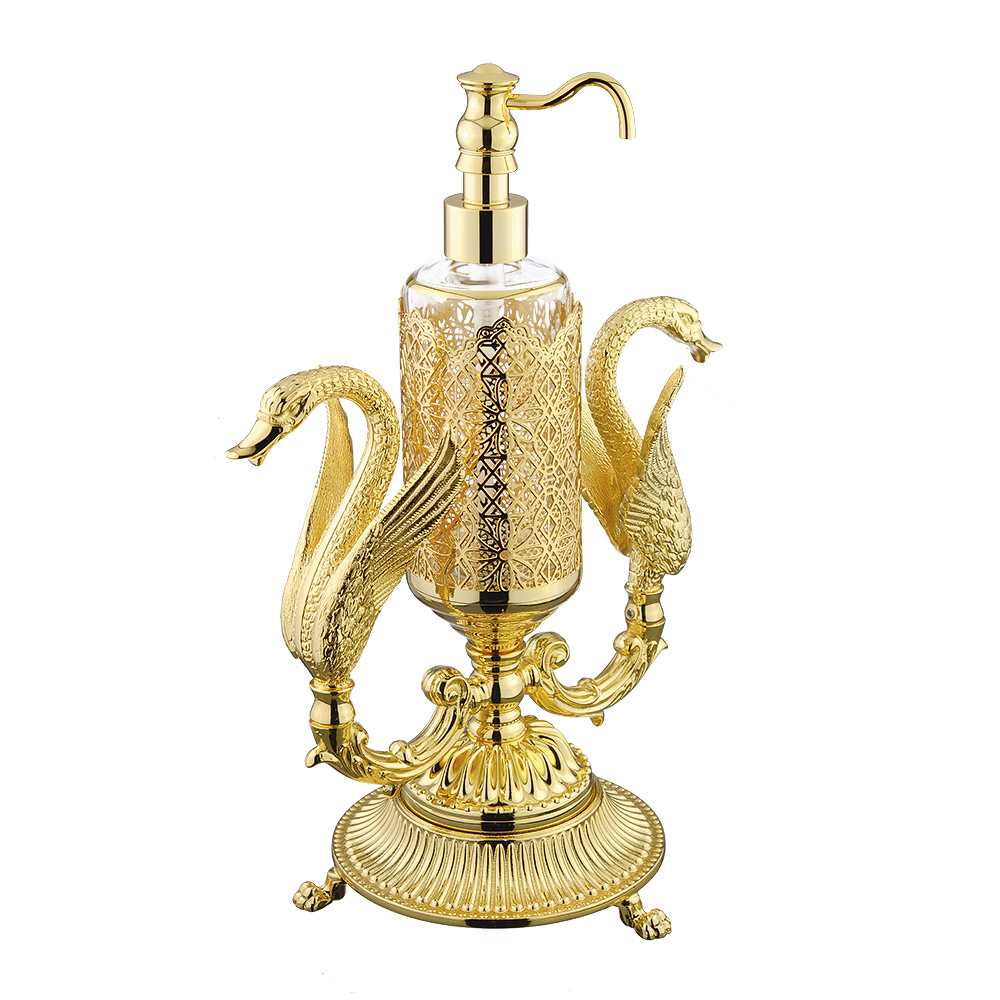 Настольный дозатор жидкого мыла коллекции LUXOR бренда MIGLIORE имеет внешнее ажурное обрамление из латуни. Внутри вставлен стеклянный дозатор, декорированный золотой полосой 24 карата. Два лебедя по бокам дозатора придают ему особо роскошный вид. Дозатор украсит вашу столешницу в ванной комнате или на кухне.  Изделие выполнено из высококачественной латуни и имеет гальваническое покрытие золотом 24 карата. Внимание: золотое покрытие очень деликатное и для ухода рекомендуется использовать чистящее средство бренда MIGLIORE для смесителей и аксессуаров с деликатными покрытиями бронза, золото, медь и протирать мягкой ветошью.
