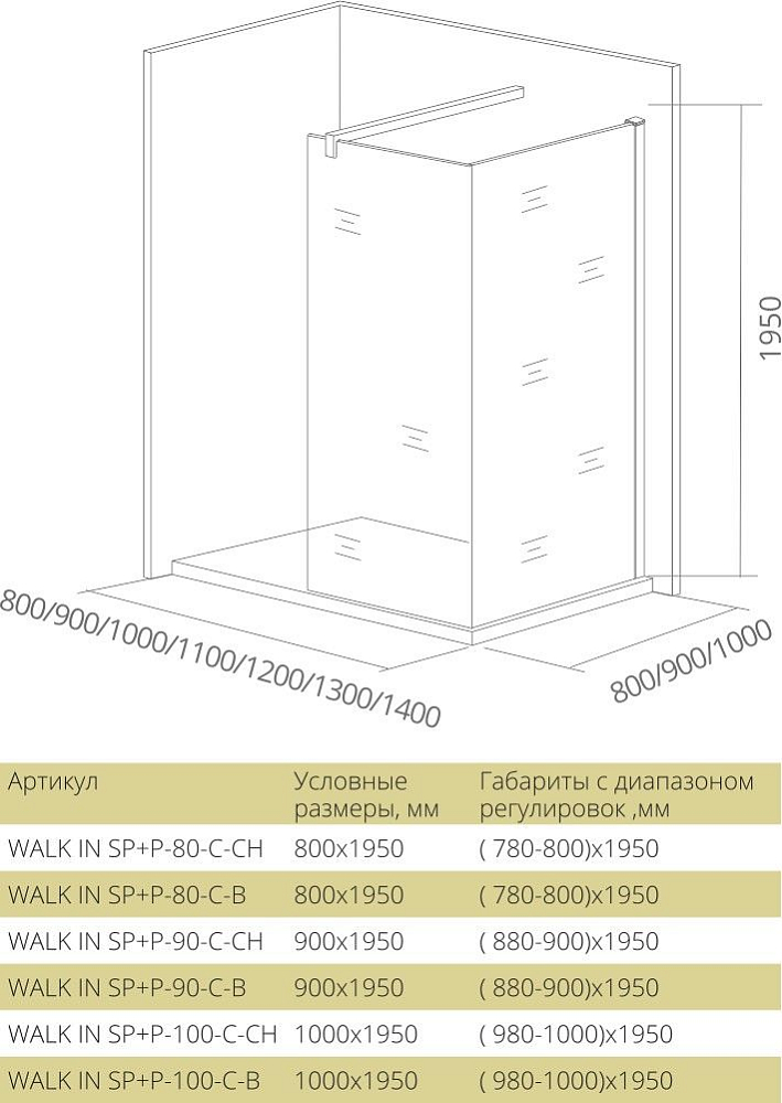 —Душевая перегородка Good Door WALK IN ВИ00020 100х195 стекло прозрачное профиль черный матовый