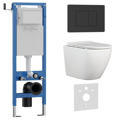 Создайте идеальную ванную комнату с комплектом сантехники, который включает подвесной унитаз BILBAO ALTO (арт. IB.BLA.231.1B1) и клавишу смыва  INOX-C цвета черный матовый, нержавеющая сталь (арт. IB.B011.002.003 ). Подвесной унитаз с безободковой системой смыва выполнен из белого фарфора, и имеет такие особенности как: