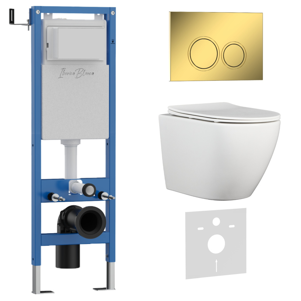 Создайте идеальную ванную комнату с комплектом сантехники, который включает подвесной унитаз BILBAO ALTO (арт. IB.BLA.231.1B1) и клавишу смыва  ESTI-O цвета золото глянцевое, ABS пластик (арт. IB.B082.006.001 ). Подвесной унитаз с безободковой системой смыва выполнен из белого фарфора, и имеет такие особенности как: