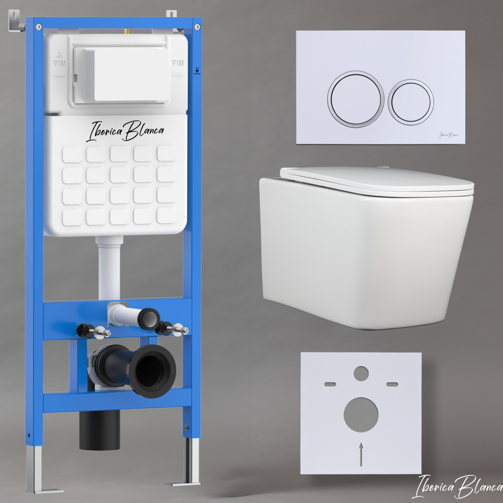 Создайте идеальную ванную комнату с комплектом сантехники, который включает подвесной унитаз TOLEDO ALTO (арт. IB.TLA.231.1B1) и клавишу смыва  ESTI-O цвета белый глянцевый, ABS пластик (арт. IB.B082.001.000 ). Подвесной унитаз с безободковой системой смыва выполнен из белого фарфора, и имеет такие особенности как: