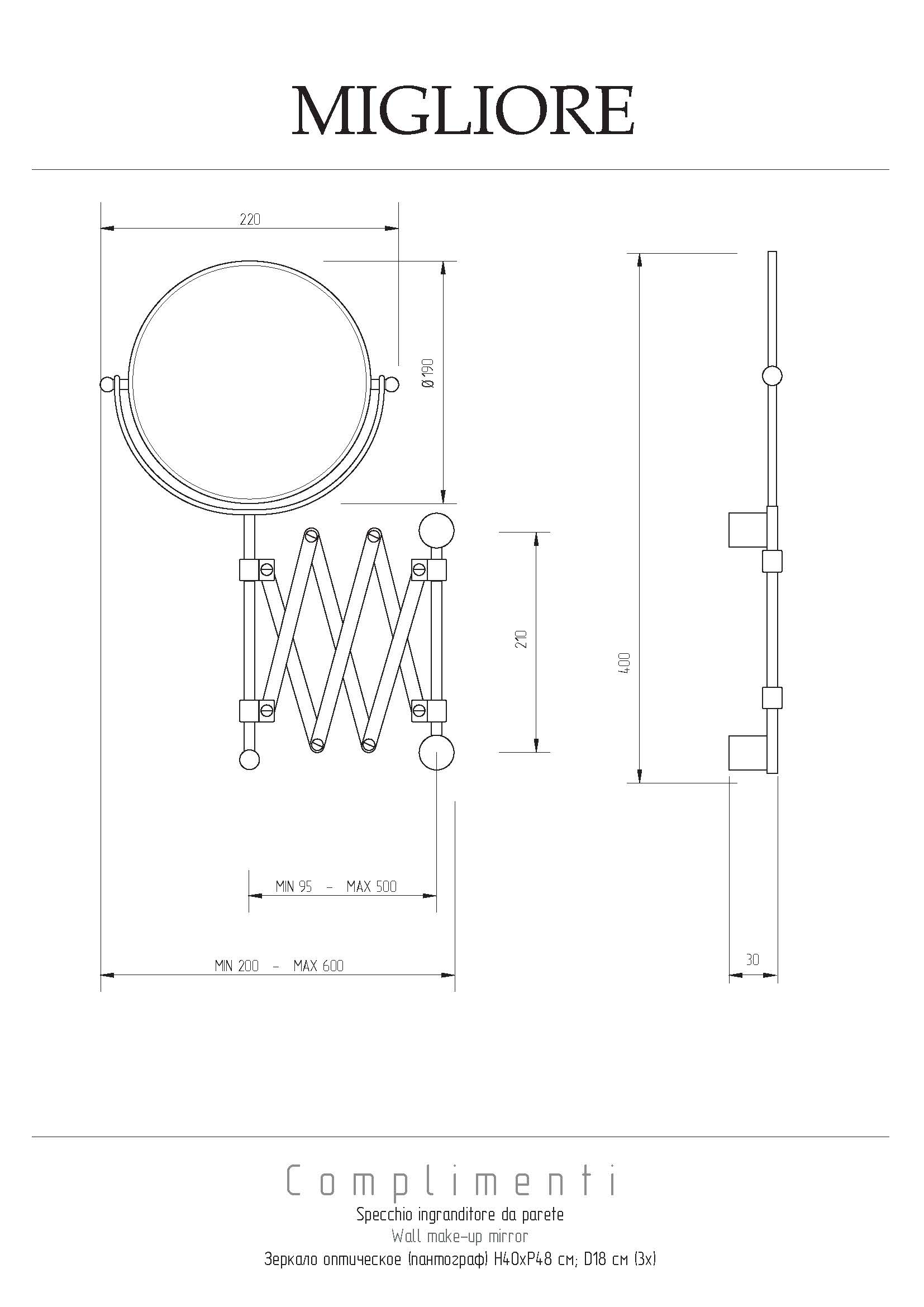 Оптическое зеркало пантограф бренда Migliore с двумя зеркальными полотнами, одно из которых имеет трехкратное увеличение для удобства проведения макияжа и других процедур. Изделие выполнено из латуни и имеет высококачественное хромо-никелиевое покрытие, которые при правильном уходе надолго сохранит свой блеск.