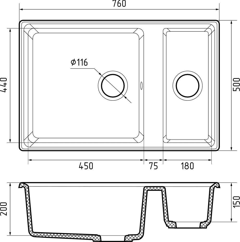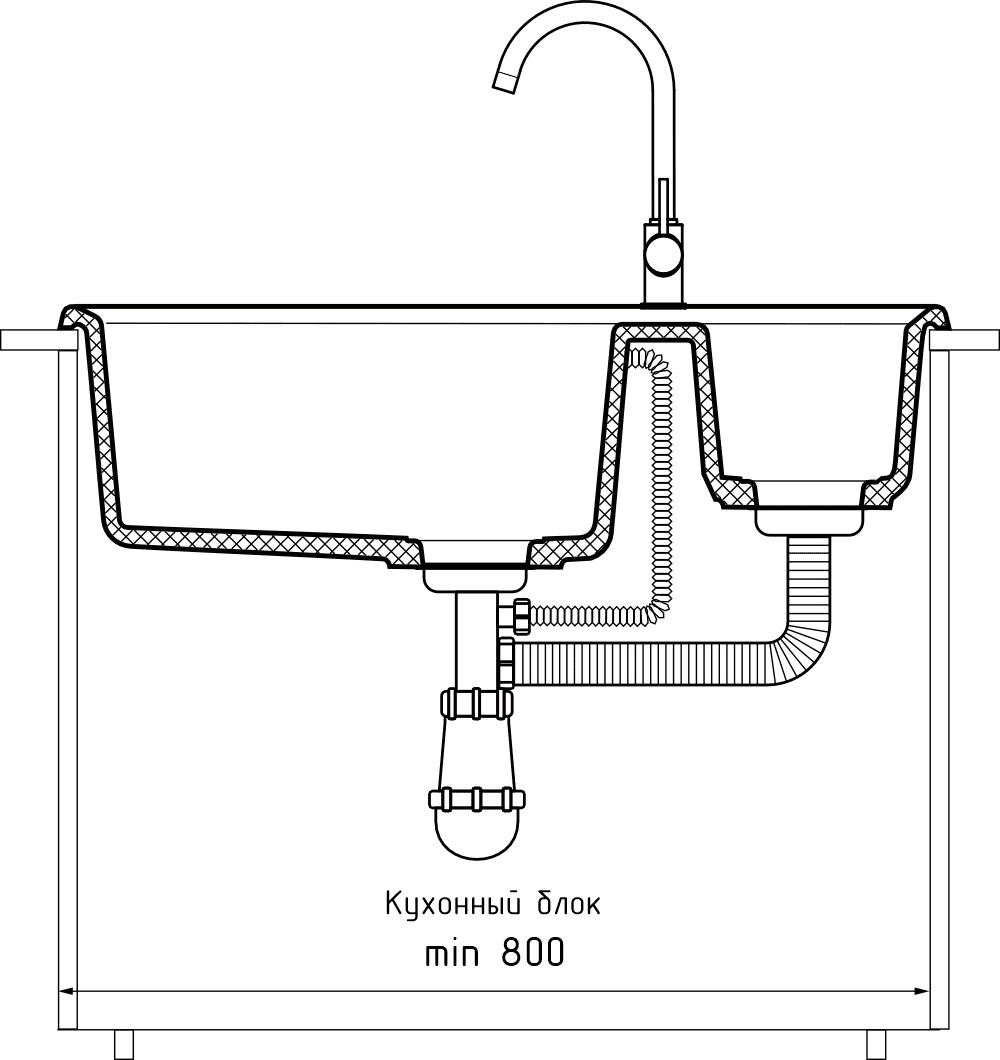 Кухонная мойка врезная из искусственного мрамора, прямоугольной формы, отверстие под смеситель отсутствует, количество чаш составляет 2 шт., размер чашей составляет 450*440*200, 180*440*150, диаметр сливного отверстия составляет 8.89 см. В комплектацию входит: мойка, сливная арматура, паспорт.