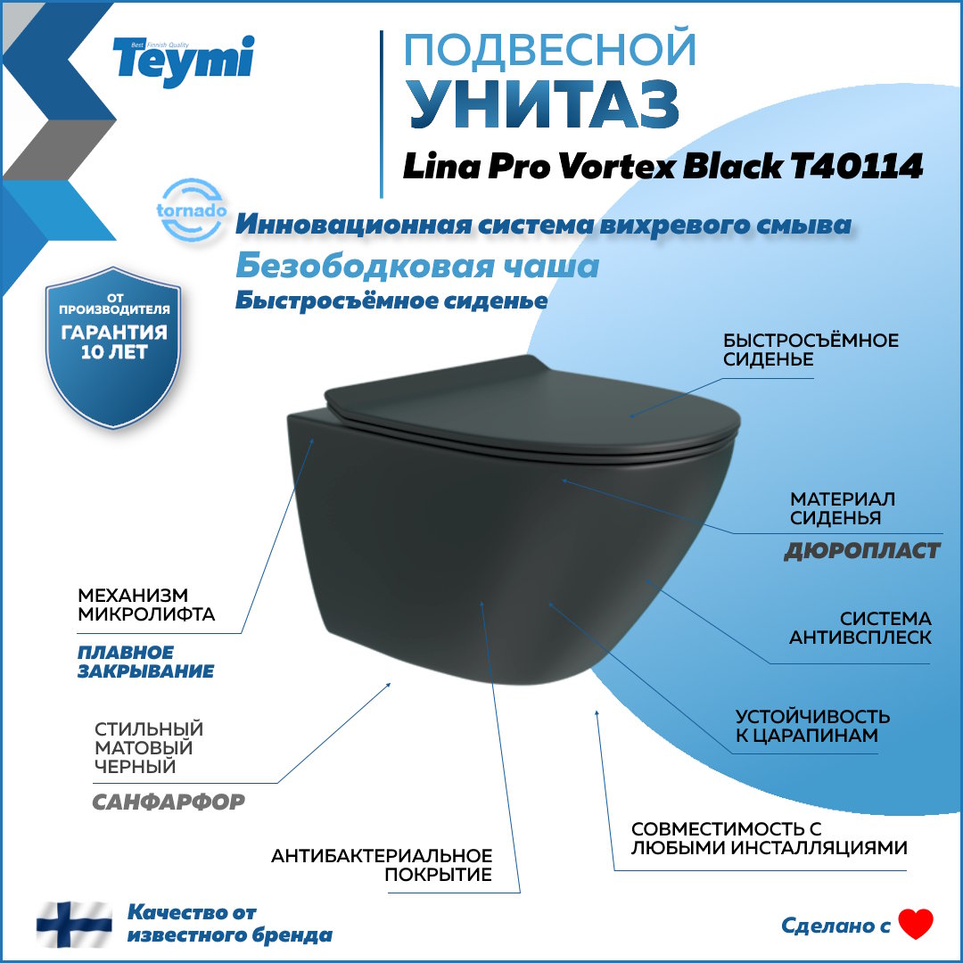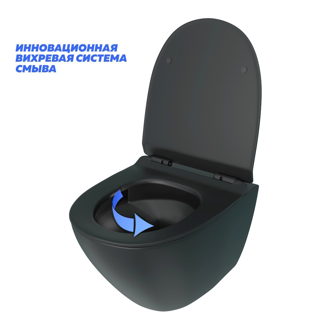 —Унитаз подвесной Teymi Lina T40114 черный с сиденьем микролифт безободковый смыв торнадо
