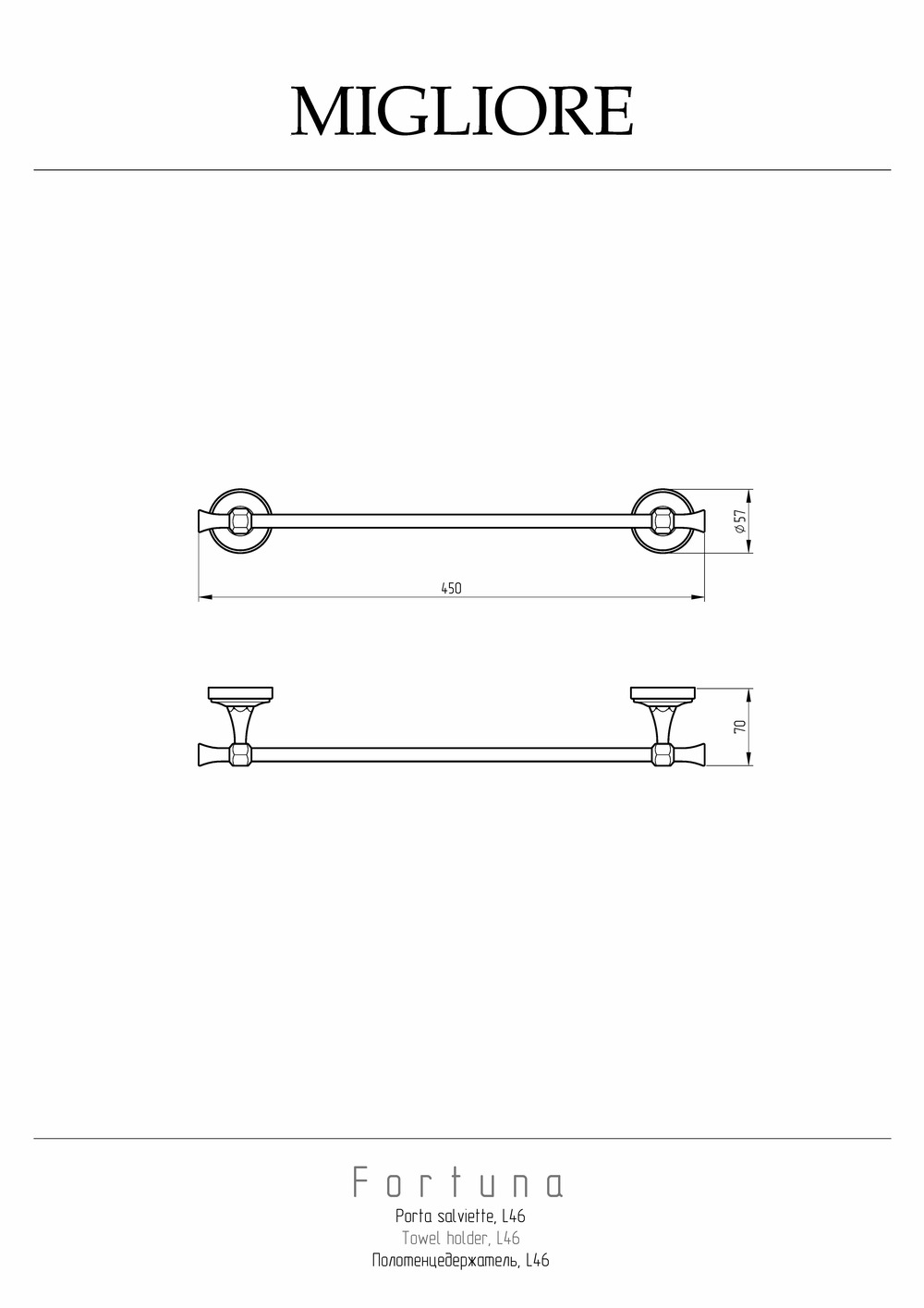 Полотенцедержатель серии FORTUNA бренда MIGLIORE  - один из необходимых аксессуаров для ванной комнаты. Его длина 46 см, что позволит разместить его даже на небольшом пространстве. Используется, как правило, для полотенца  небольшого размера. Также удобно разместить  рядом с биде. Изделие выполнено из латуни и имеет высококачественное хромо-никелиевое покрытие, которое при правильном уходе надолго сохранит  свой блеск. Рекомендуется использовать чистящее средство бренда MIGLIORE для смесителей и аксессуаров с хромированным покрытием.