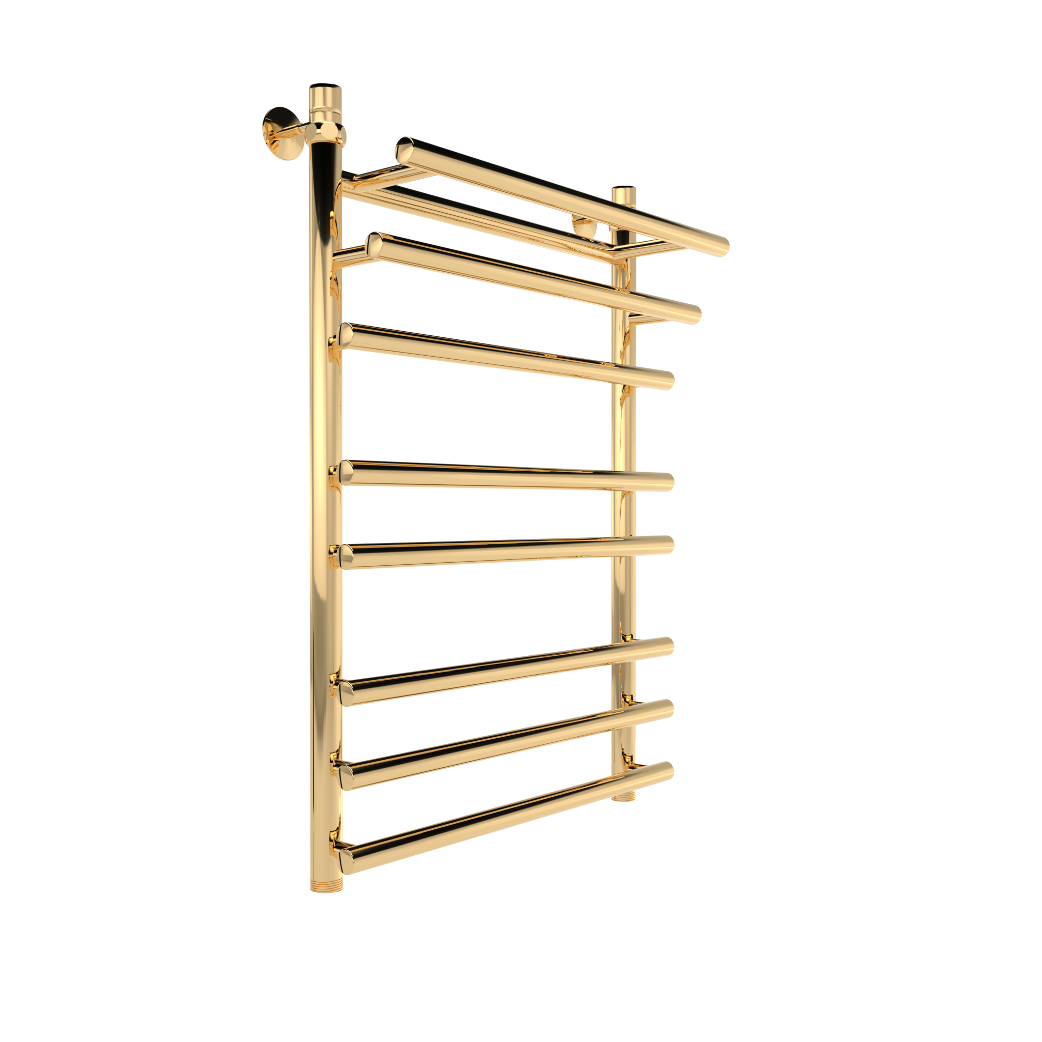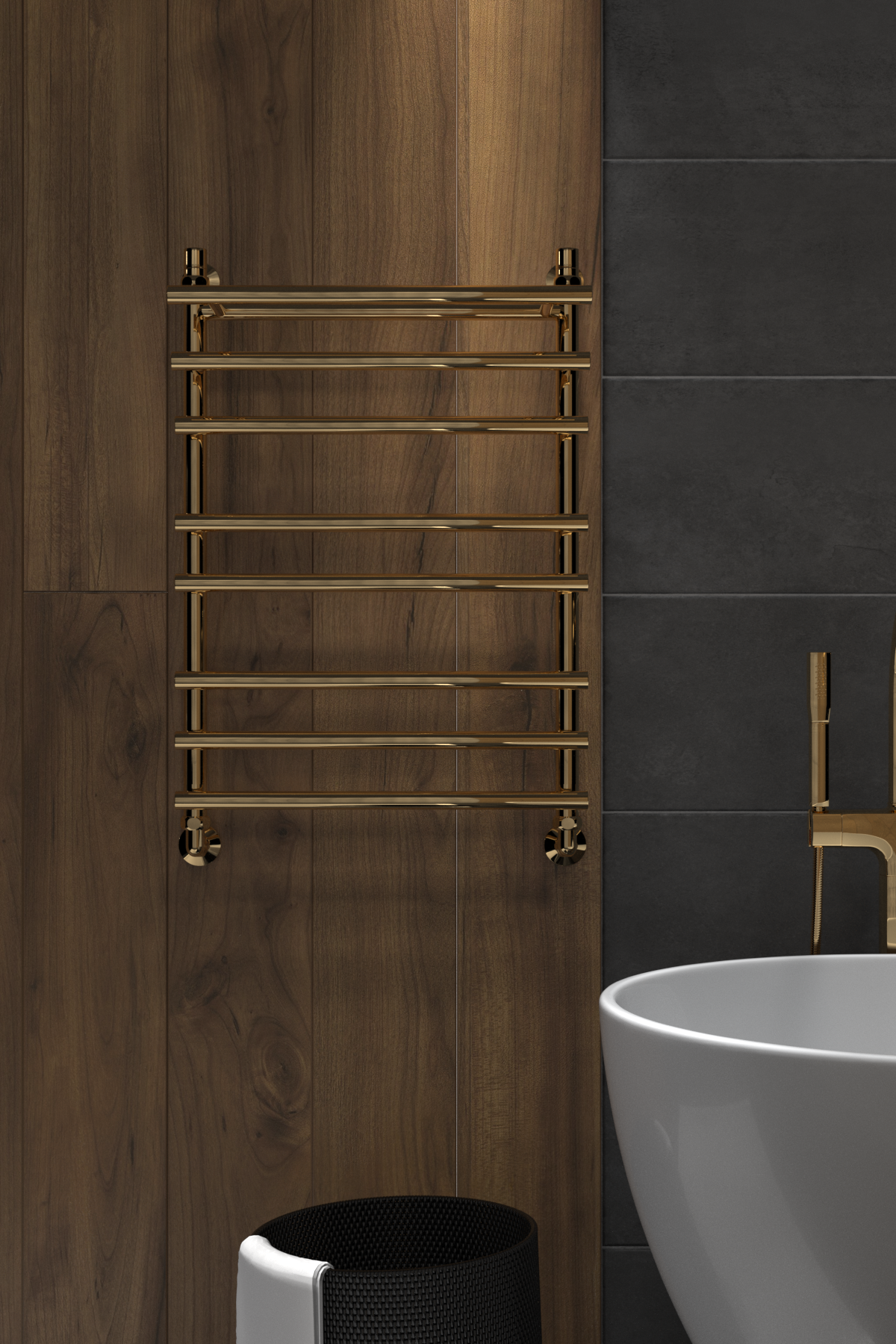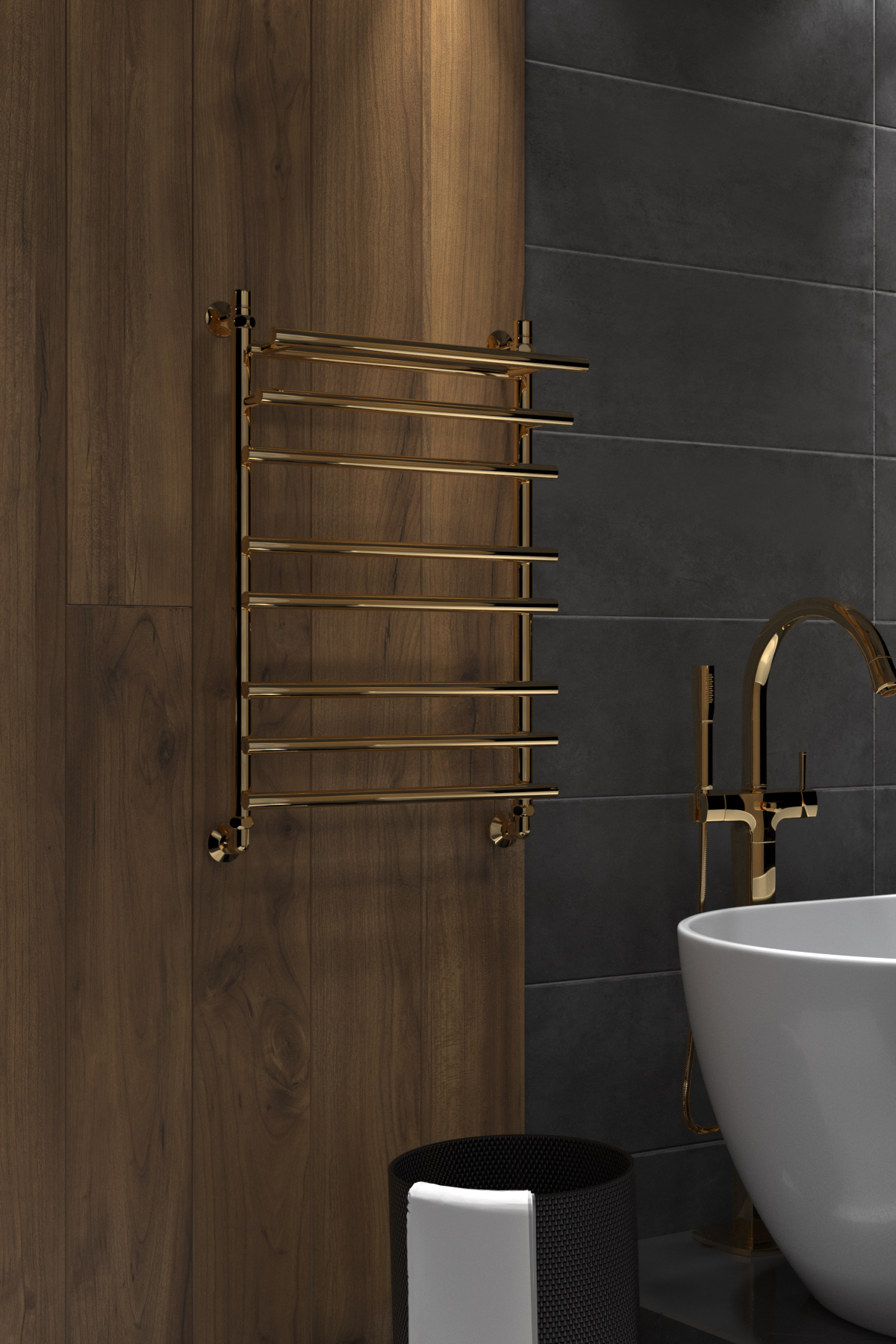 Эта элегантная лесенка в золотом цвете с каскадным расположением перекладин не только быстро высушит полотенца, но и станет изысканным дополнением интерьера вашей ванной комнаты.