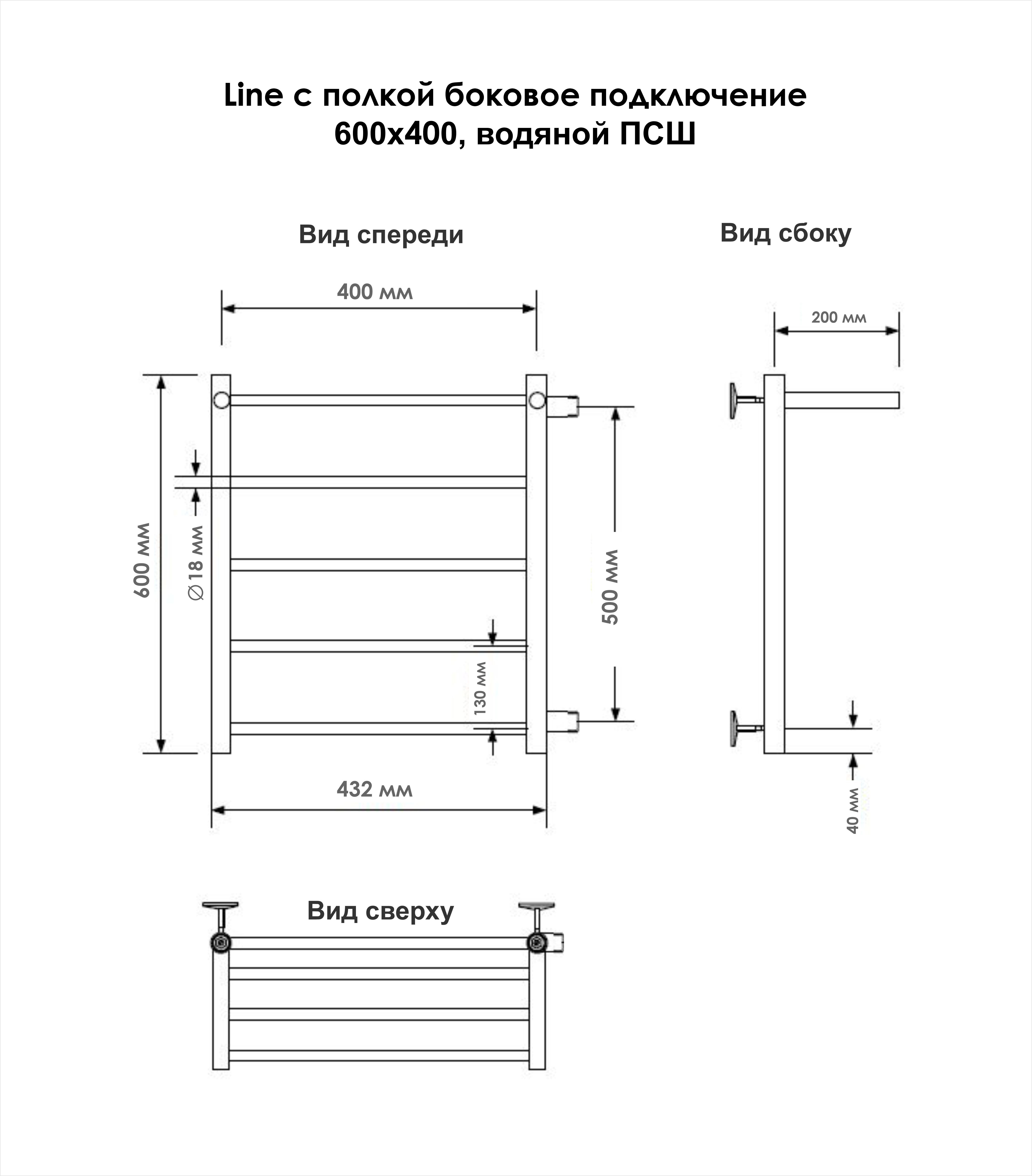 Полотенцесушитель водяной INDIGO Line с полкой с боковым подключением в размере 600х400 (ВхШ) выполнен из нержавеющей стали.