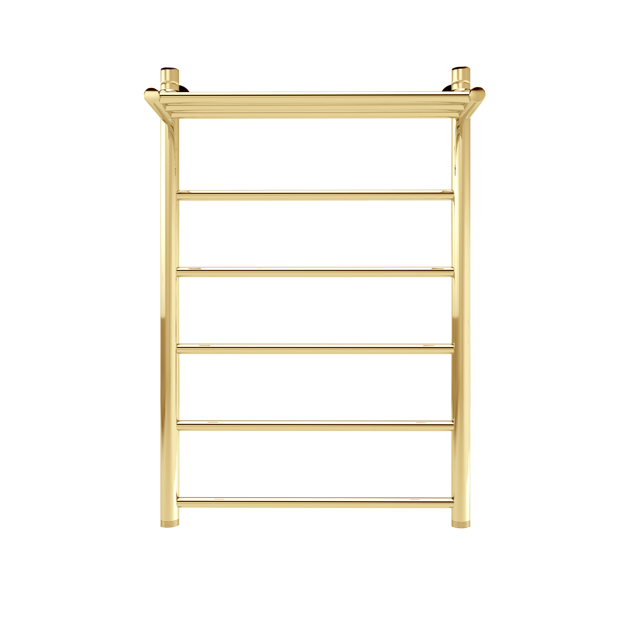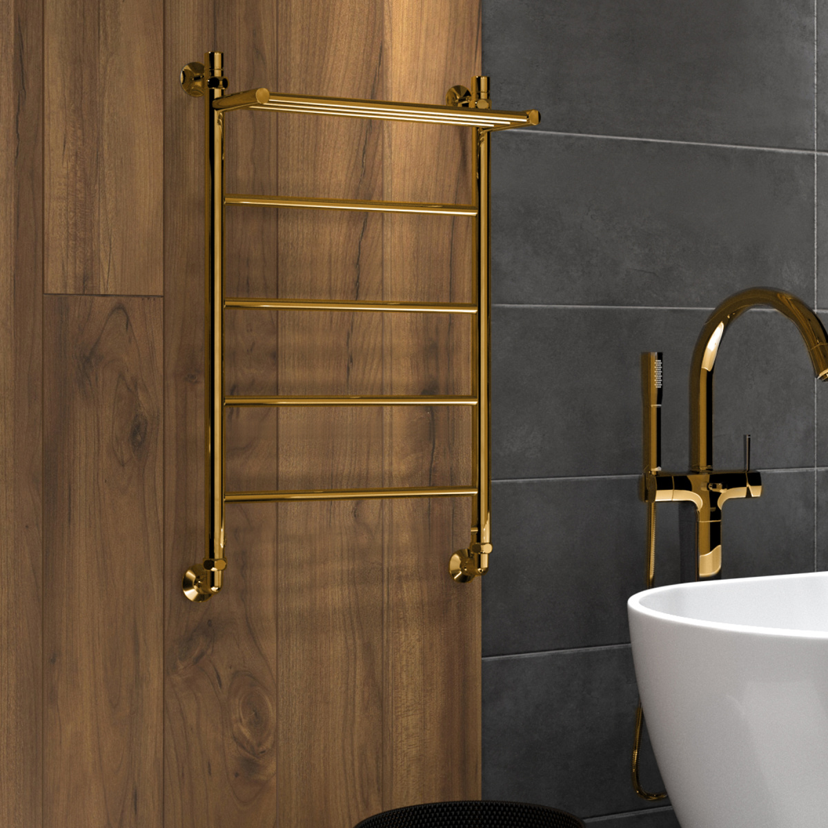 Конструкция "лесенка" с несколькими перекладинами позволяет эффективно разместить большое количество полотенец и белья. Полочка добавляет удобства для хранения ванных принадлежностей.