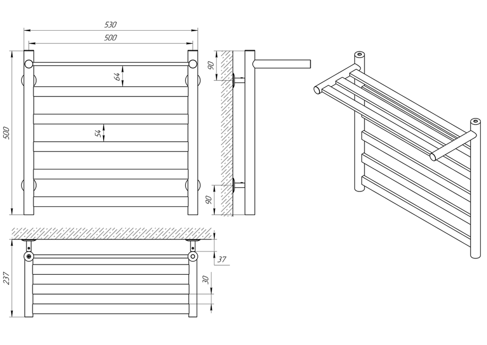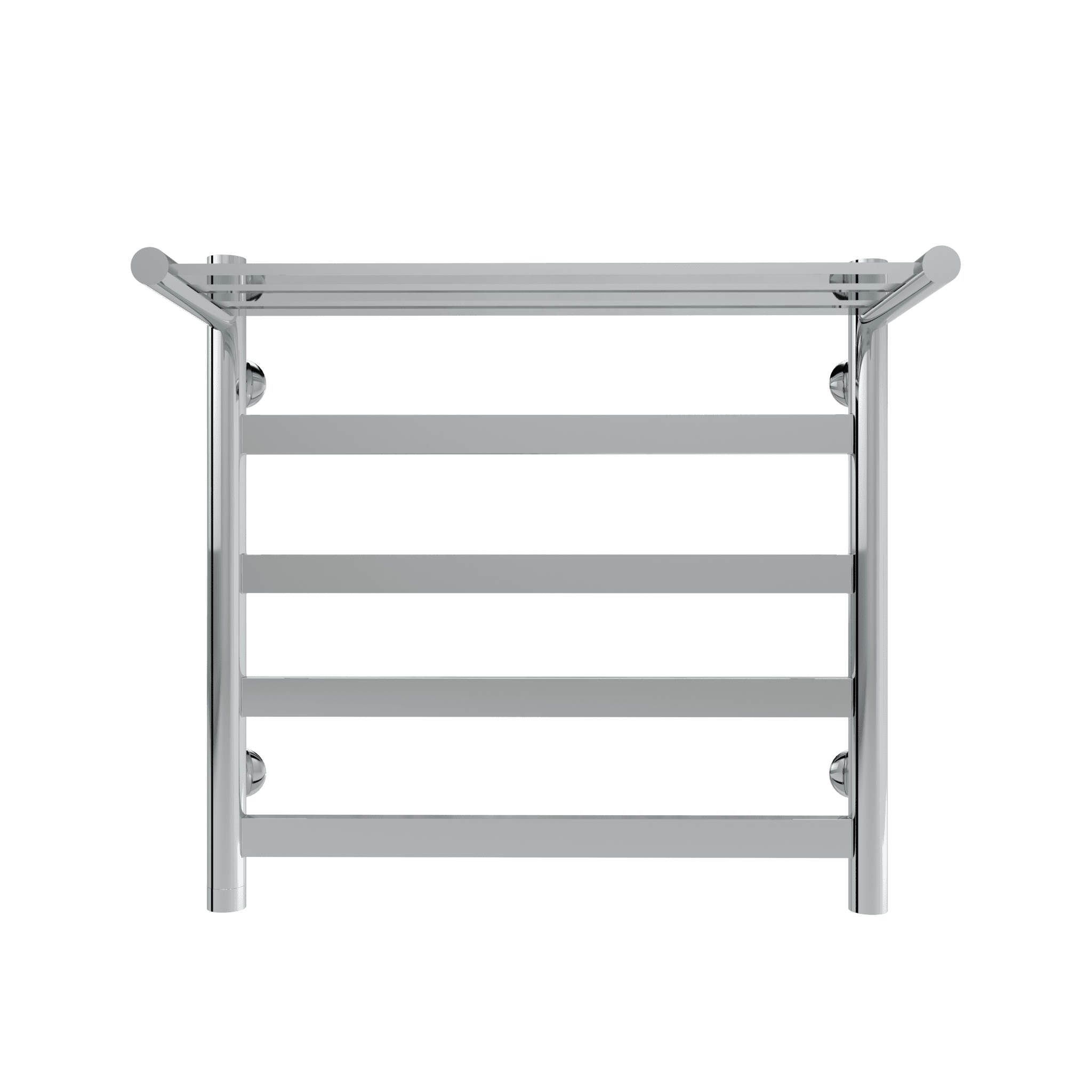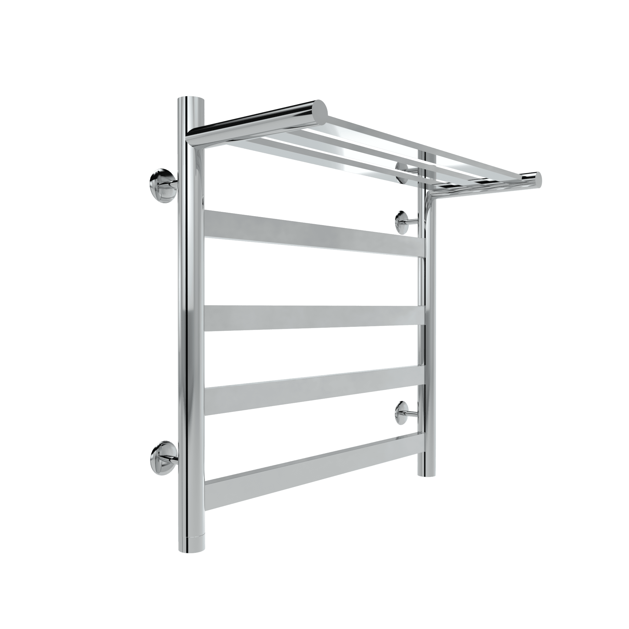 Дизайн сочетает в себе минимализм и практичность: круглые коллекторы гармонично сочетаются с плоскими перекладинами, обеспечивая эффективный нагрев полотенец и белья. Полочка создаёт дополнительное пространство для размещения полотенец и прочих банных принадлежностей.
