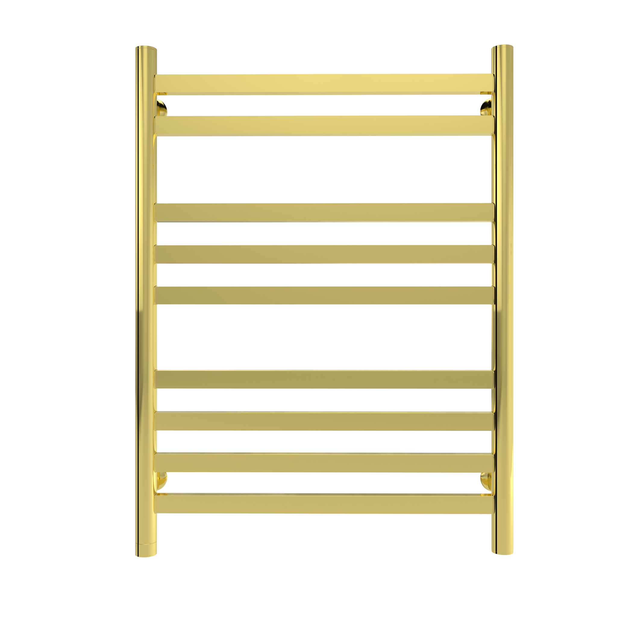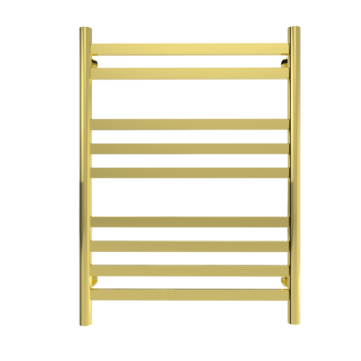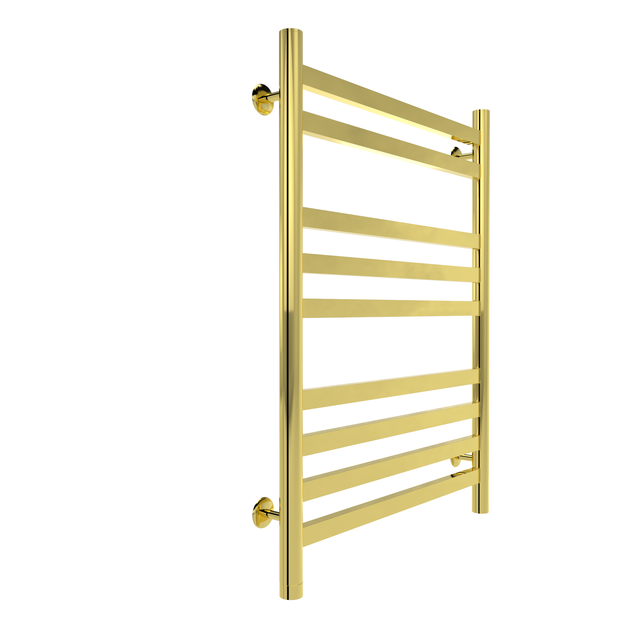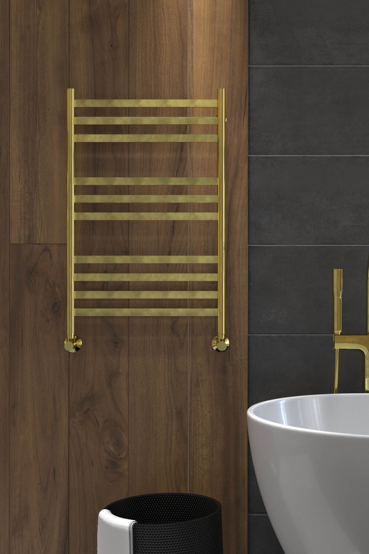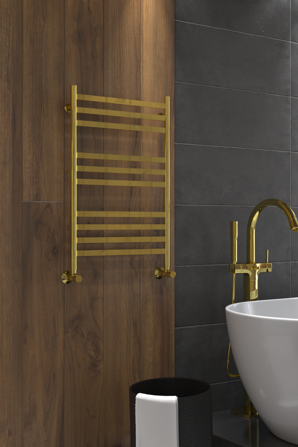 Дизайн сочетает в себе минимализм и практичность: круглые коллекторы гармонично сочетаются с плоскими перекладинами, обеспечивая эффективный нагрев полотенец и белья.