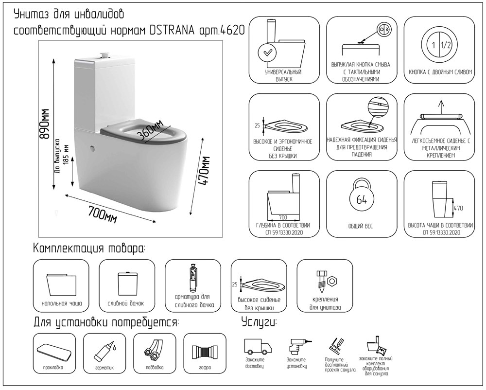 —Унитаз напольный с бачком Dstrana 4620 белый без сиденья безободковый каскадный смыв