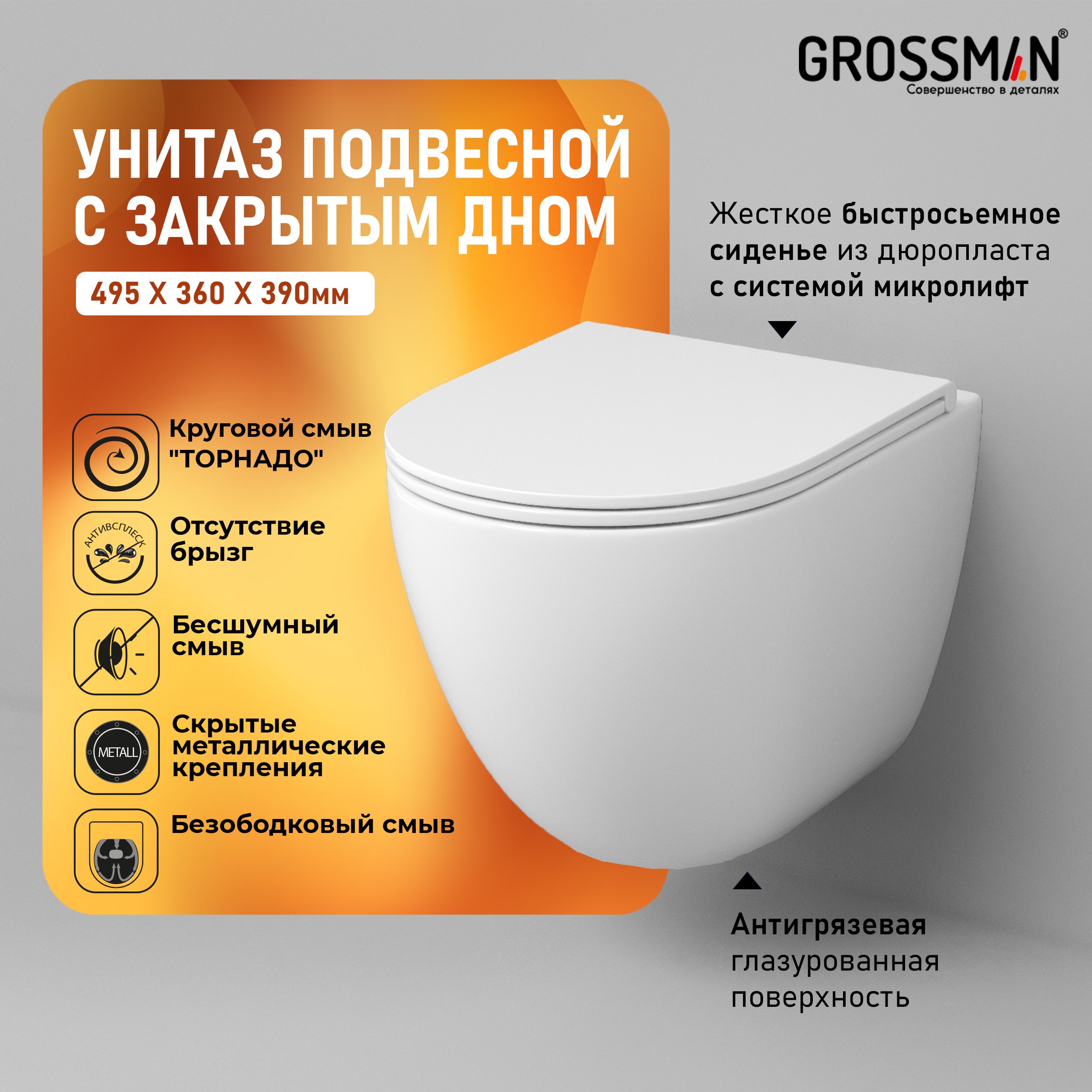 —Унитаз подвесной Grossman Торнадо GR-4455SQC белый глянцевый с сиденьем микролифт безободковый смыв торнадо