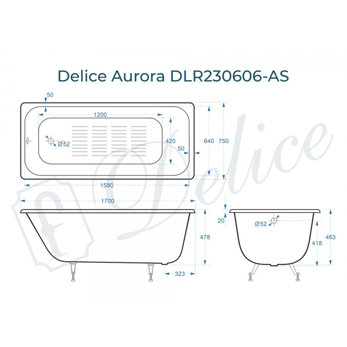 Delice Aurora серия Elite в размере 170х75 см производится с ручками, без ручек, с антискользящим покрытием и с гладким дном.